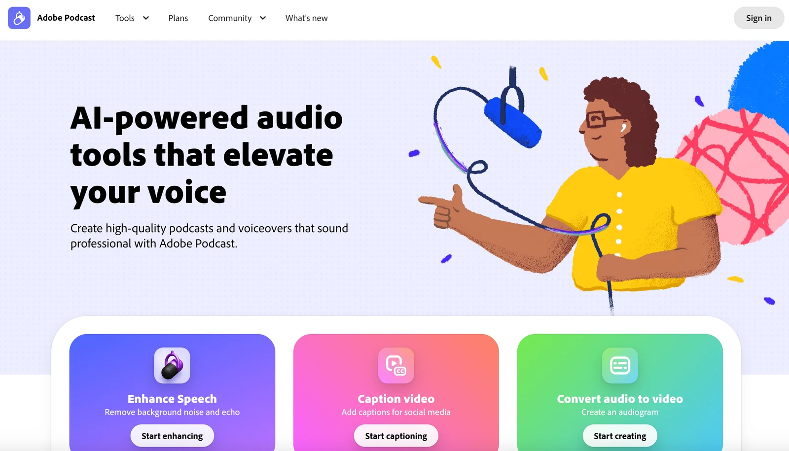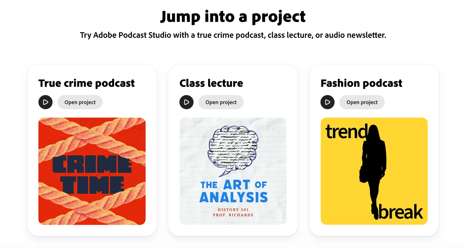 Adobe Podcast is a browser-based audio platform for recording, transcribing, editing, enhancing, and sharing spoken-word content. It combines web recording tools with automatic transcription and one-click audio enhancement to deliver clearer, more polished voice recordings without desktop software. The editor is text-forward—allowing users to edit audio via transcripts—and provides export and sharing options for podcast workflows. Its value lies in simplifying common podcast production tasks into a lightweight, accessible web app backed by Adobe’s audio processing technology.