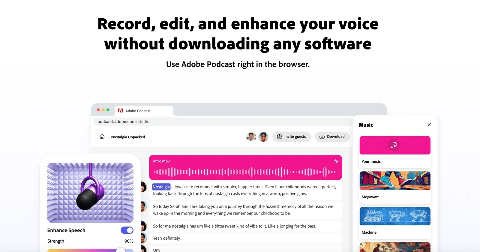 Web-based audio recording, automatic transcription, and one-click speech enhancement for podcasting and voice content.