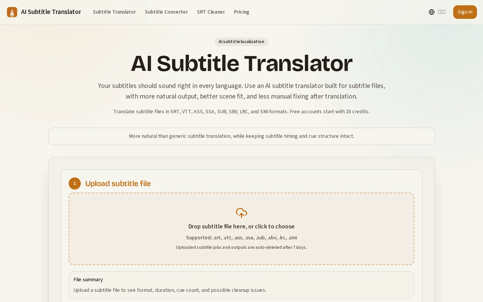 Web-based AI subtitle translator for SRT, VTT, ASS, SSA, and SUB that preserves timing and improves natural localization.