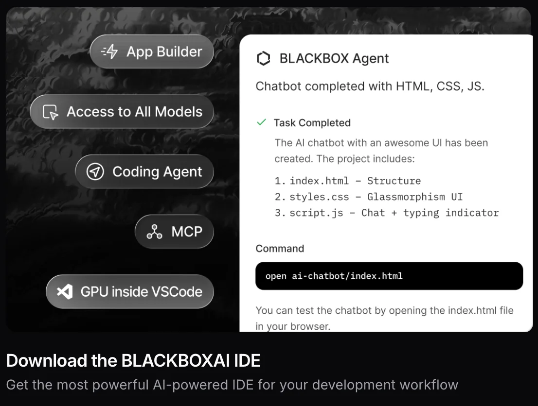 Blackbox (Blackbox.ai) is an AI agent platform that aims to transform work and learning by providing conversational and task-oriented agent capabilities. The product is positioned as developer-first and API-driven, enabling builders and teams to integrate agent functionality into applications and workflows. Blackbox emphasizes enterprise readiness and large-scale adoption, claiming usage by over 10 million users and deployment within Fortune 500 companies. Its value proposition centers on embedding intelligent automation and learning assistance into developer and business tooling via extensible APIs and platform support.