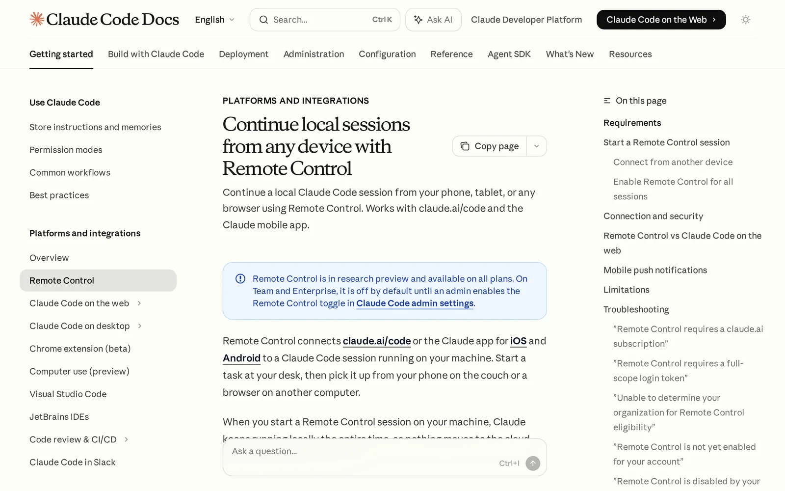 Remote Control lets you continue a local Claude Code session from any phone, tablet, or browser while the session runs entirely on your machine.