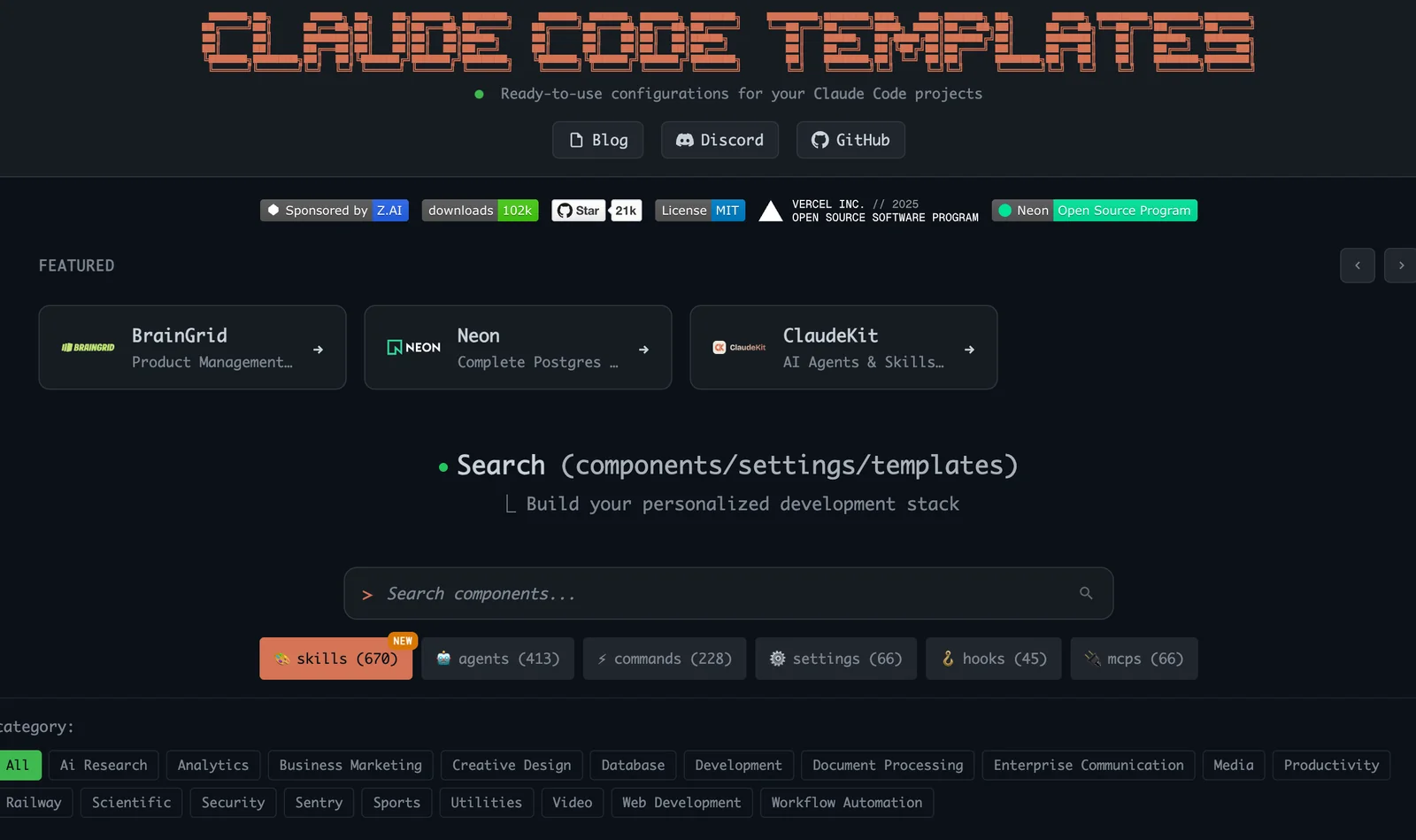 Claude Code Templates is a curated catalog and CLI for accelerating development with Anthropic's Claude Code. It provides ready-made agents, custom commands, settings, hooks, MCP integrations, and project templates that can be installed and managed via a Node.js CLI and a companion static website. The project adds observability and diagnostics (real-time analytics, health checks, session insights), a skills manager dashboard, Cloudflare sandbox integration with the Claude Agent SDK, and a security validation system for components. It helps teams standardize Claude Code installations, speed up onboarding, and maintain safe, production-ready component catalogs.