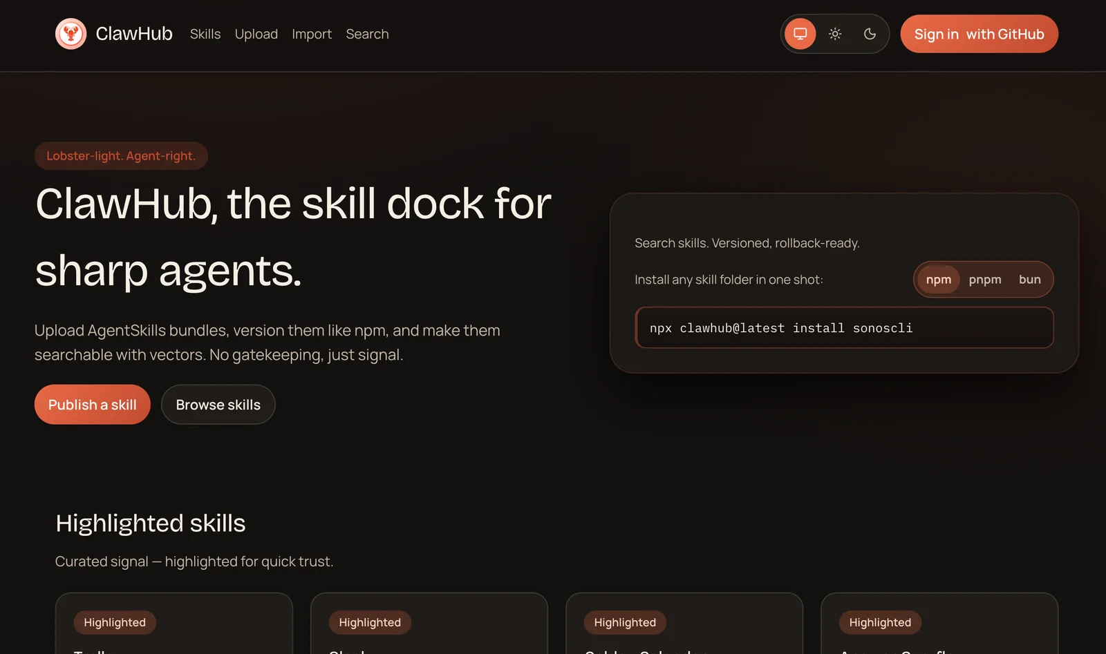 A fast skill registry for agents that provides semantic (vector) search and a CLI + web interface for publishing and discovering skills.