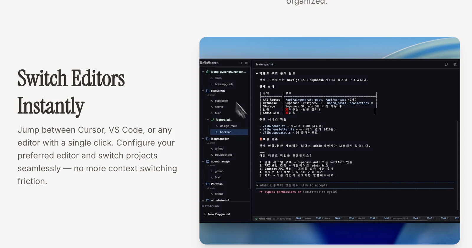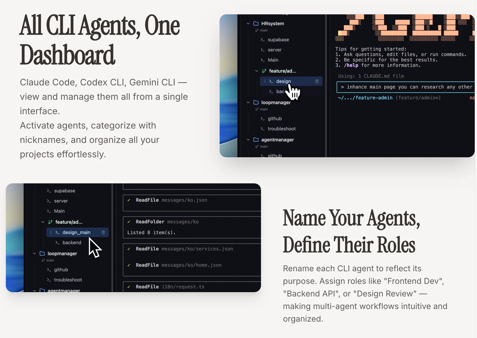 Manage Claude Code, Codex CLI, and Gemini CLI from a single dashboard to organize agents and switch editors instantly.