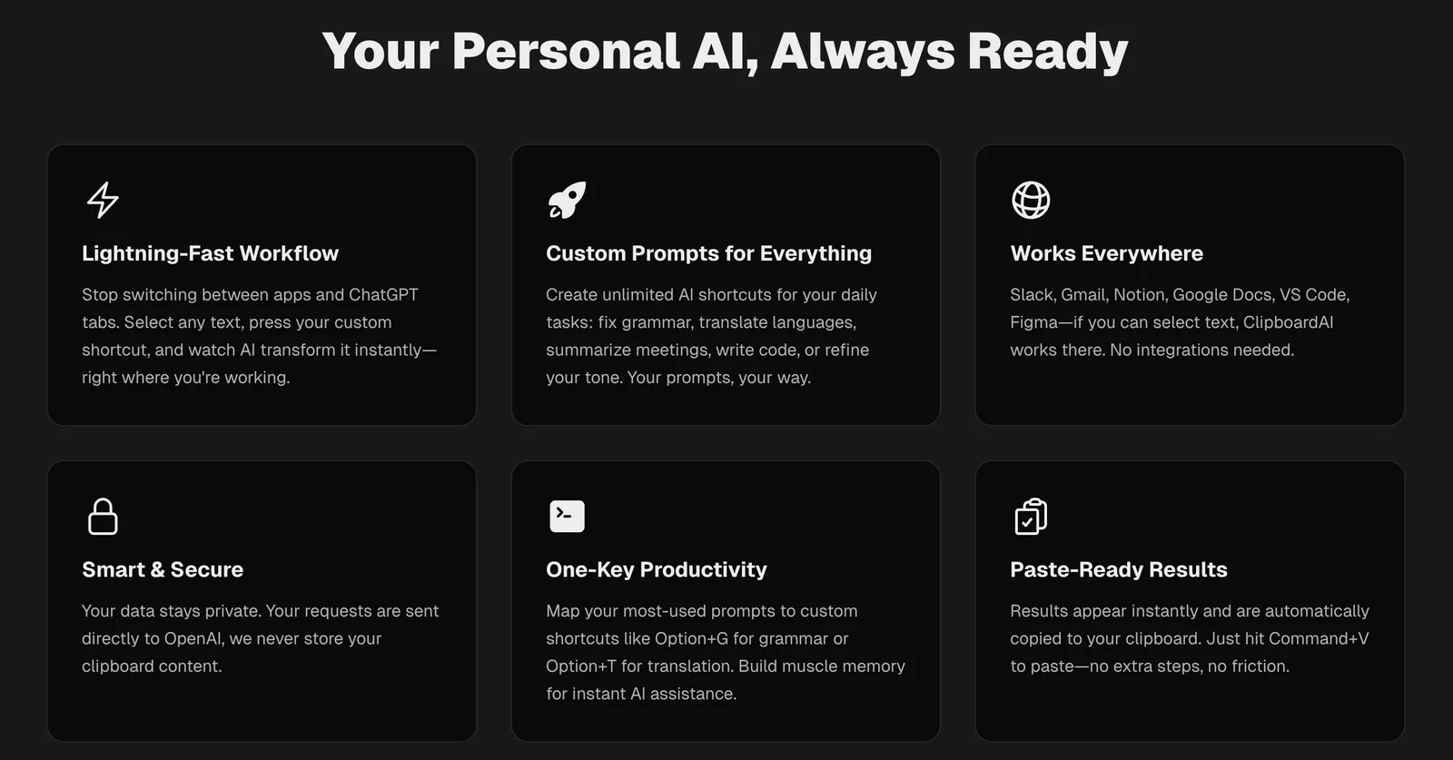 Run custom AI prompts instantly via keyboard shortcuts inside any app to transform selected text or images without copy‑paste.