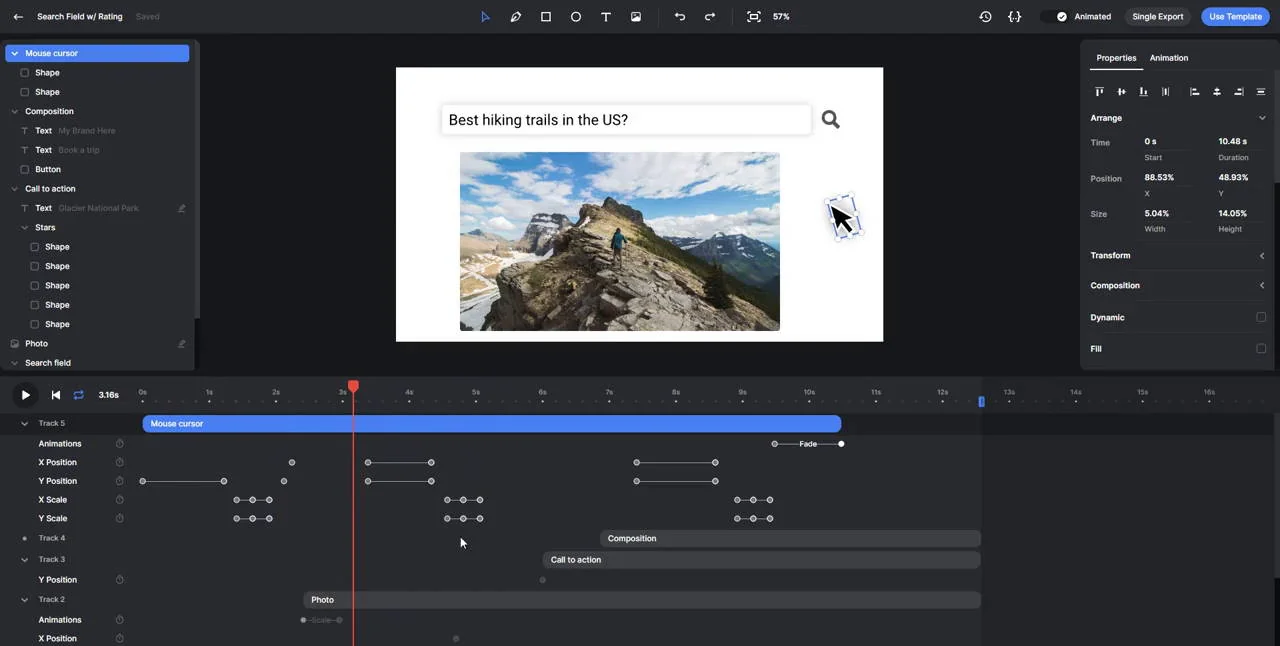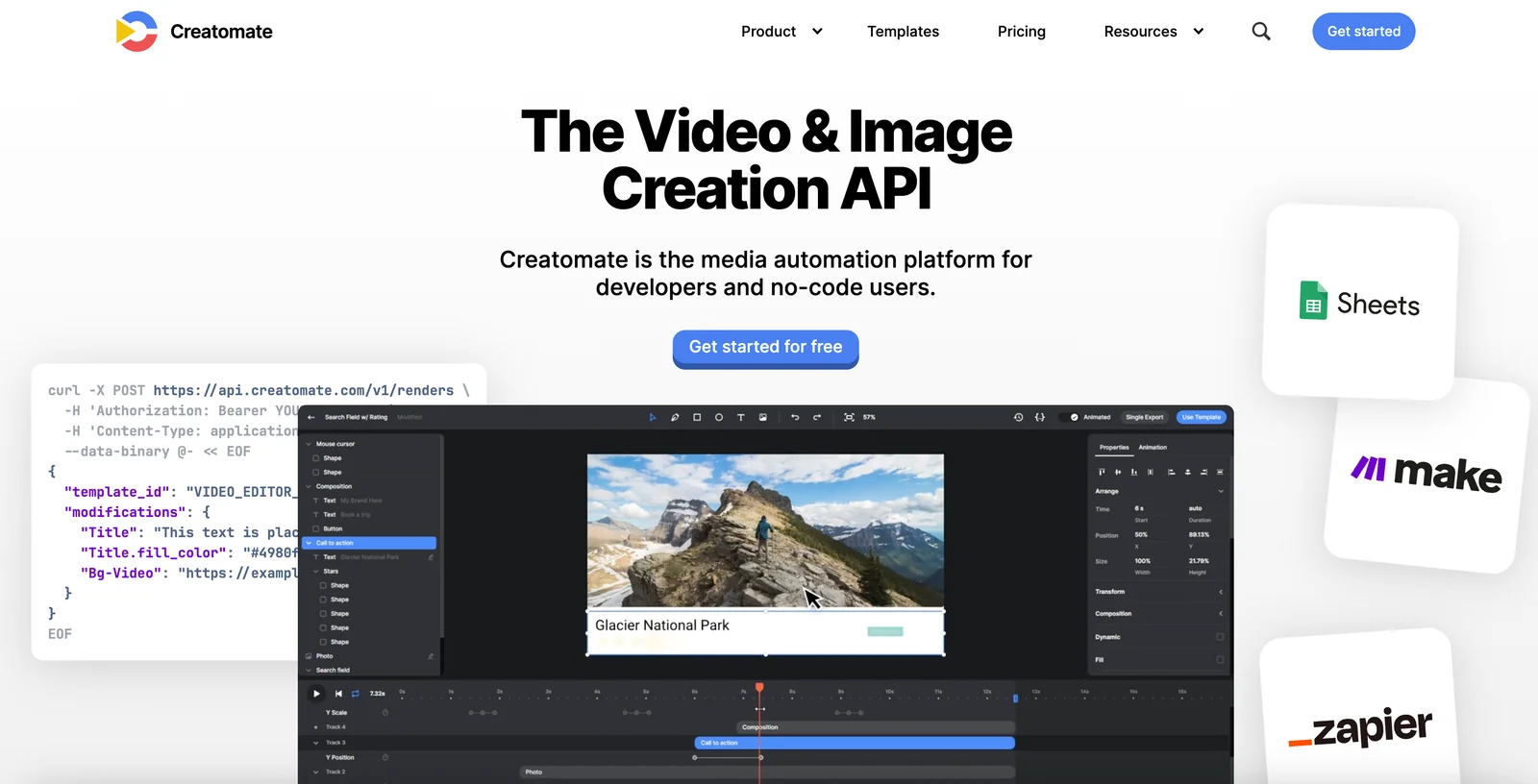 Creatomate is a cloud-based media generation API and online editor that automates creation and rendering of videos, GIFs and images from templates and JSON data. It processes all rendering on Creatomate's infrastructure and provides client libraries (Node.js, PHP, etc.), a Preview SDK for in-browser previews, and integrations with Zapier and Make to enable no-code and coded workflows. Users can build dynamic, personalized media by combining reusable templates, composable elements (videos, images, text, shapes), keyframes and animations, then render final MP4/GIF/JPEG/PNG outputs programmatically or from the web editor.