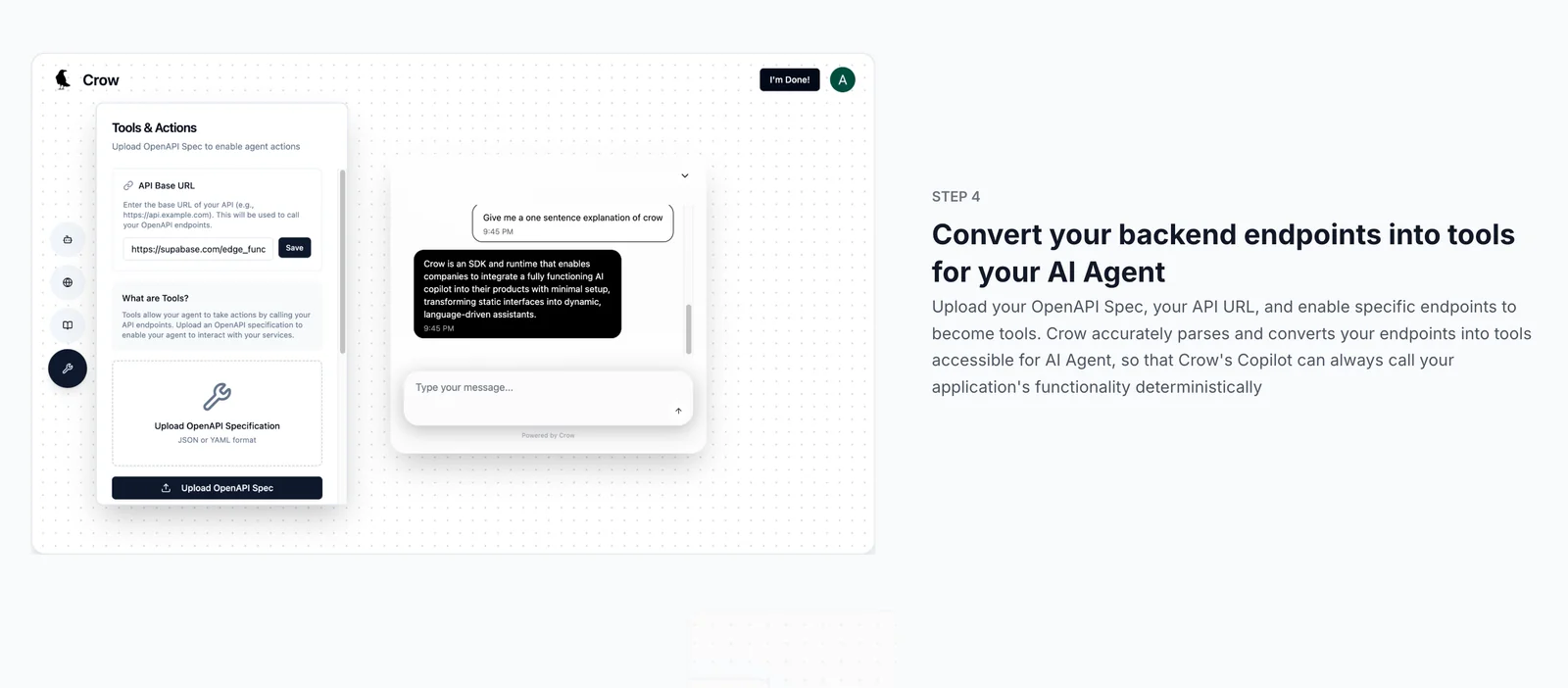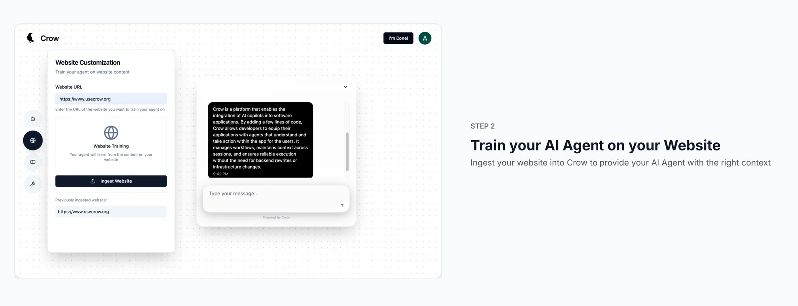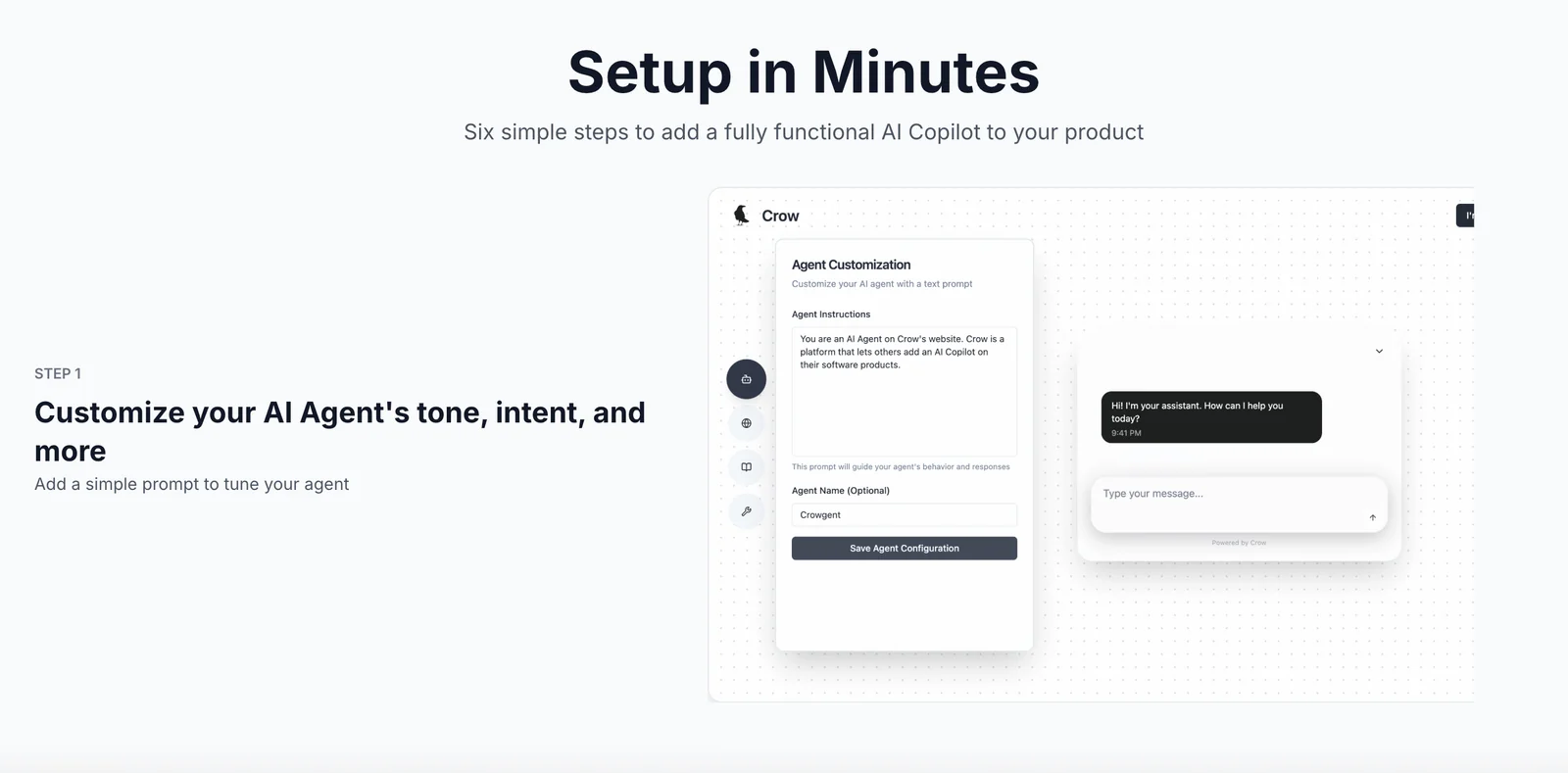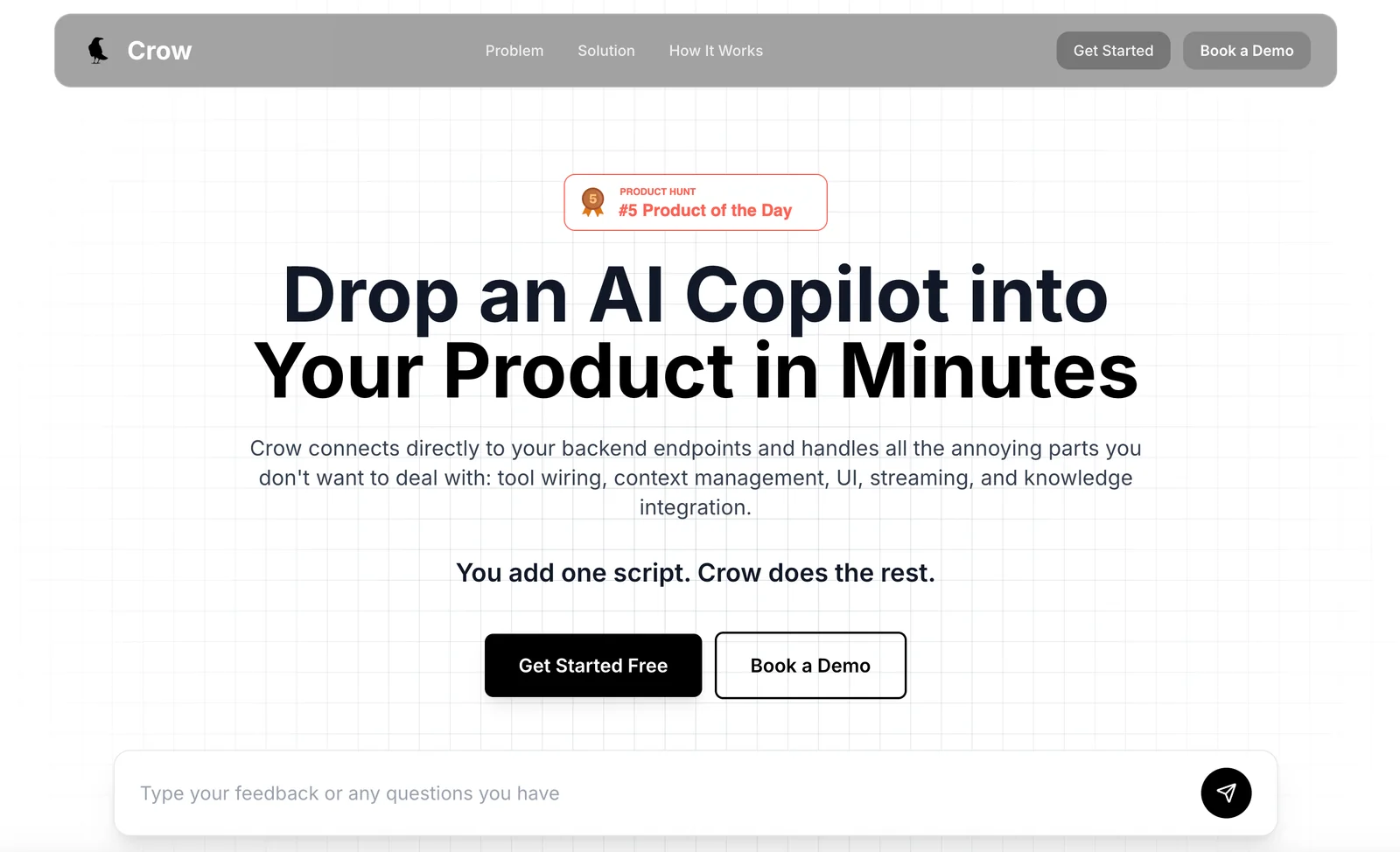 Crow is a language user interface platform designed to add real, in-product AI assistance to software quickly. It provides an embeddable copilot experience for end users, enabling natural-language interactions inside existing applications with minimal engineering changes. Crow emphasizes rapid integration (advertising a 10-minute setup) and avoiding backend rewrites, lowering the barrier to ship conversational workflows and contextual assistance directly within a product.