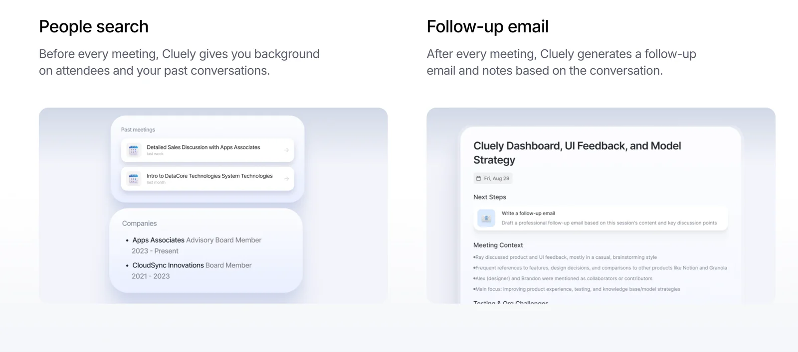 Cluely is a live AI meeting assistant that captures meeting audio and delivers real-time notes, instant answers to questions, and contextual insights while the call is happening. Rather than only producing post-meeting transcripts, Cluely is designed to assist participants during live meetings by surfacing relevant information, answering queries on demand, and highlighting key points as the conversation progresses. Its value is in reducing manual note-taking, improving meeting focus, and enabling faster decision-making through immediate, contextual assistance.