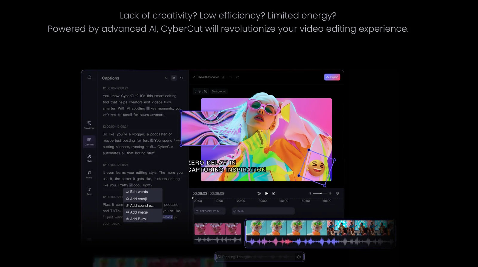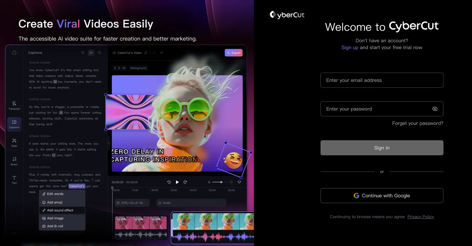 CyberCut is an AI-driven video editing platform designed to help creators, marketers, and teams produce viral short-form videos faster. The service uses machine learning to generate content ideas and hooks, accelerate the editing process through automated suggestions and edits, and simplify the overall production workflow with templates and export presets optimized for social platforms. CyberCut focuses on reducing manual editing time and lowering the barrier to creating high-engagement clips by combining idea generation, smart editing assistance, and workflow automation.