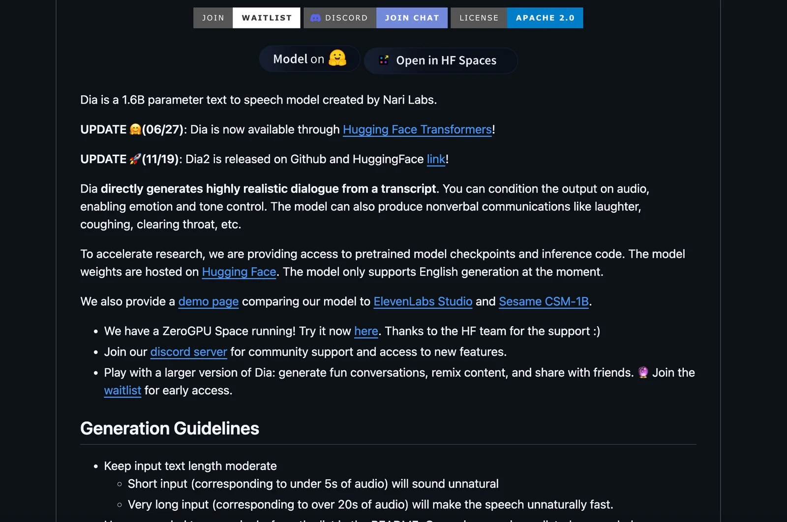 Dia is a text-to-speech (TTS) model designed to synthesize ultra-realistic dialogue in one pass. The project emphasizes efficient generation of conversational speech, enabling the model to produce coherent multi-turn or multi-speaker outputs with natural prosody and timing. Published as an open-source GitHub repository by nari-labs, Dia is intended for use by researchers and developers who need high-quality dialogue synthesis for applications such as conversational agents, media production, and speech research.