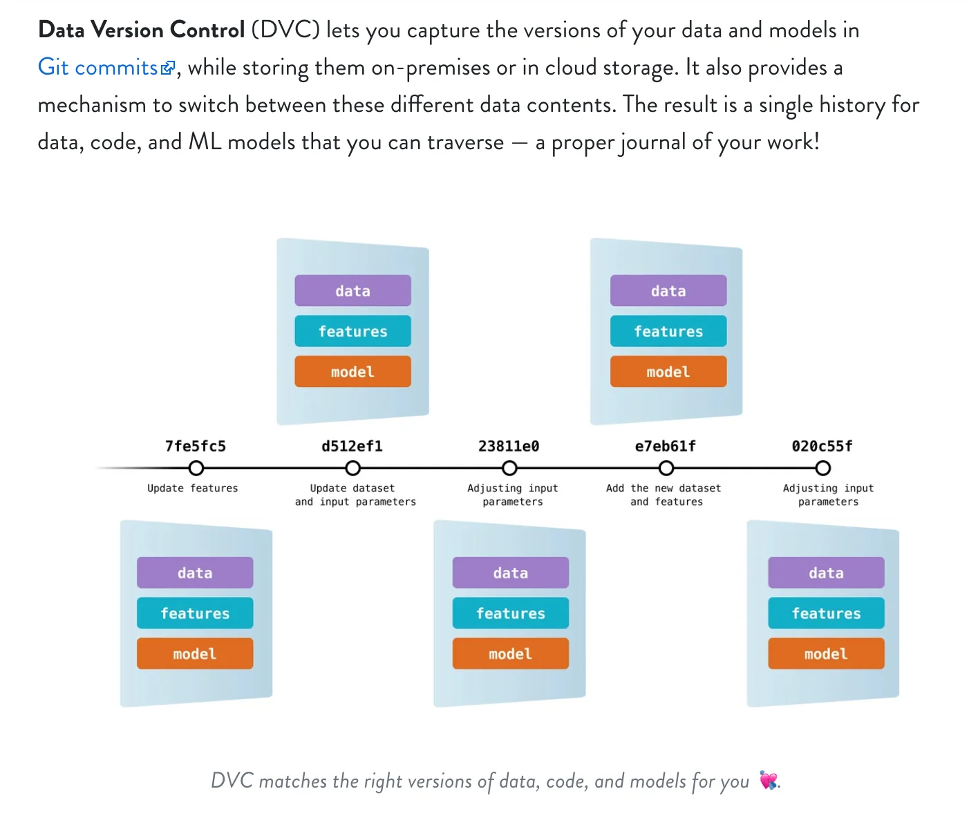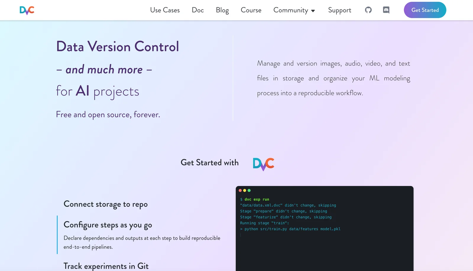 DVC (Data Version Control) is an open-source tool that provides Git-like versioning and workflow primitives for data, models, and ML experiments. It stores lightweight metafiles in Git while tracking large files, datasets, and model artifacts in external storage (S3, GCS, Azure, SSH, etc.), enabling reproducible pipelines and efficient cache-based transfers. DVC also provides pipeline orchestration (DVC pipelines), experiment tracking and comparison, metrics and plots, and integrations with CI/CD and Git hosting to support collaboration across data science and engineering teams. The tool is designed to make ML projects reproducible, shareable, and easier to manage without forcing teams to leave familiar Git workflows.