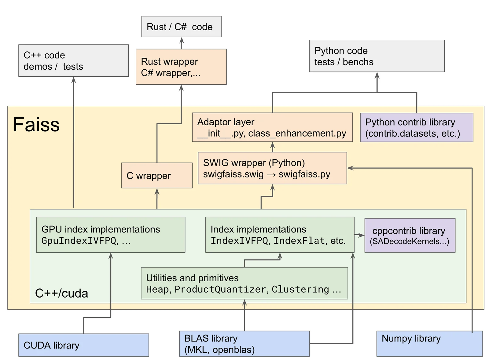 Faiss is an open-source library for efficient similarity search and clustering of dense vectors, developed by Meta AI Research (facebookresearch). It provides a wide range of index structures (flat, quantized, inverted-file, graph-based, and binary indexes), optimization techniques (product quantization, residual quantizers, PCA), and CPU/GPU implementations to enable fast nearest-neighbor and range searches at large scale. Faiss exposes C++ and Python bindings, supports GPU acceleration and multi-GPU workflows, and is designed for production usage and research benchmarking on millions to billions of vectors.