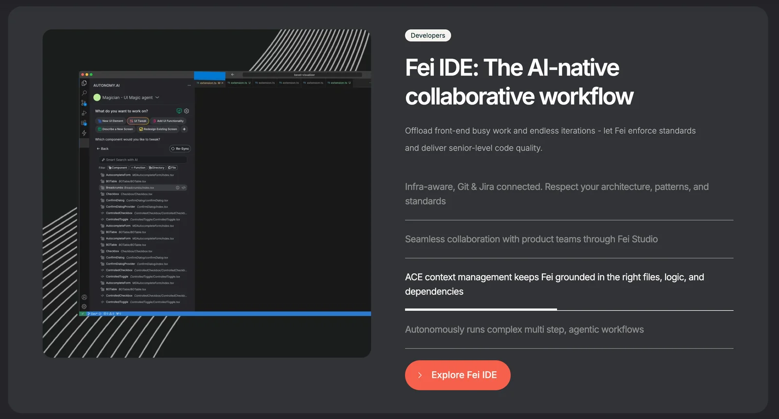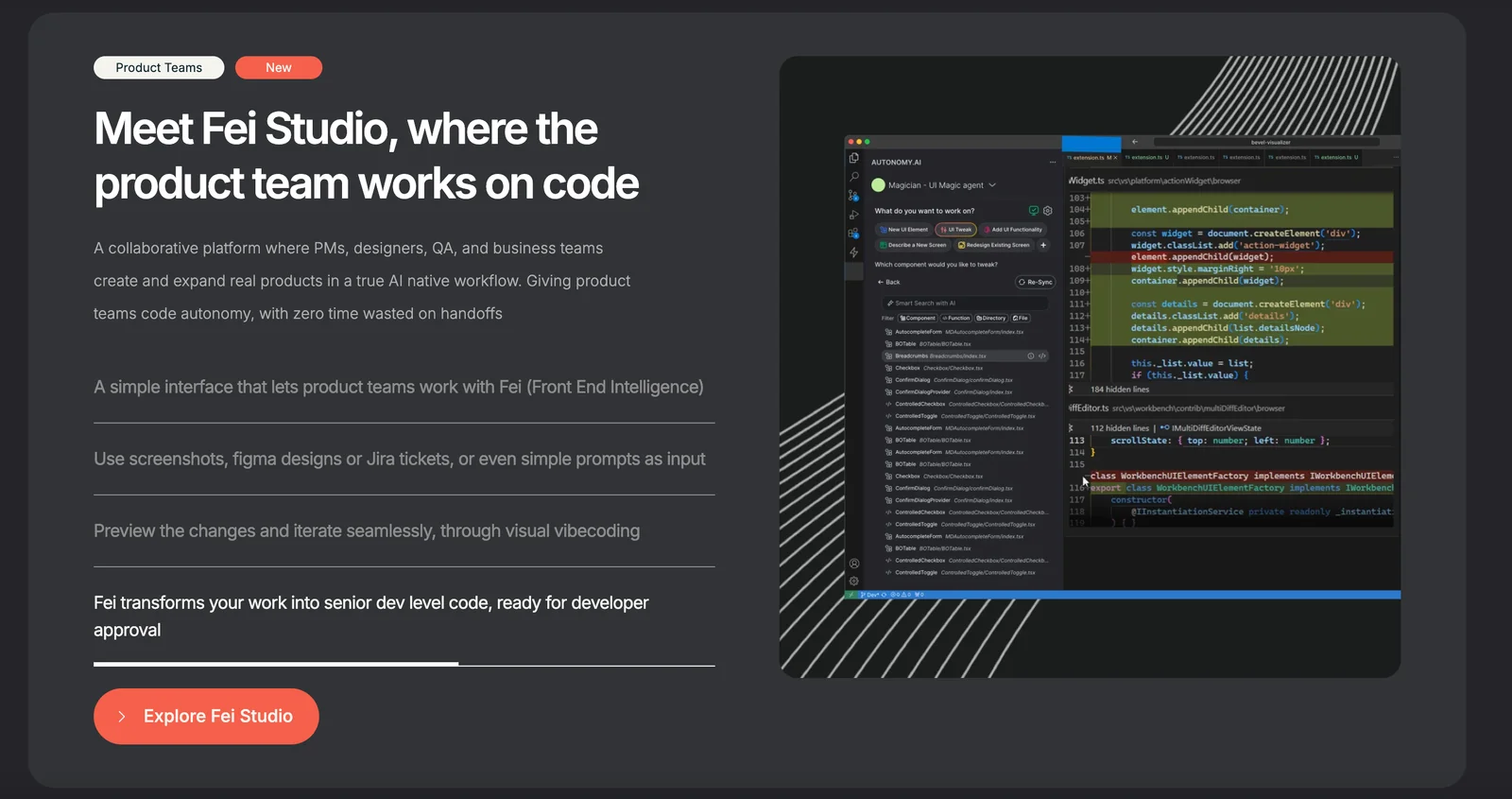 Fei (from AutonomyAI) is positioned as an AI-native product development platform that brings engineering, design, and product teams together in a single shared environment. It focuses on creating production-safe workflows so artifacts produced by design and product teams are directly usable by engineering, reducing handoffs and rework. Fei emphasizes collaboration, reproducibility, and continuity from prototype to production by embedding AI-assisted automation into design, specification, and delivery processes. The platform aims to accelerate delivery, improve cross-functional alignment, and preserve fidelity between design intent and production code.