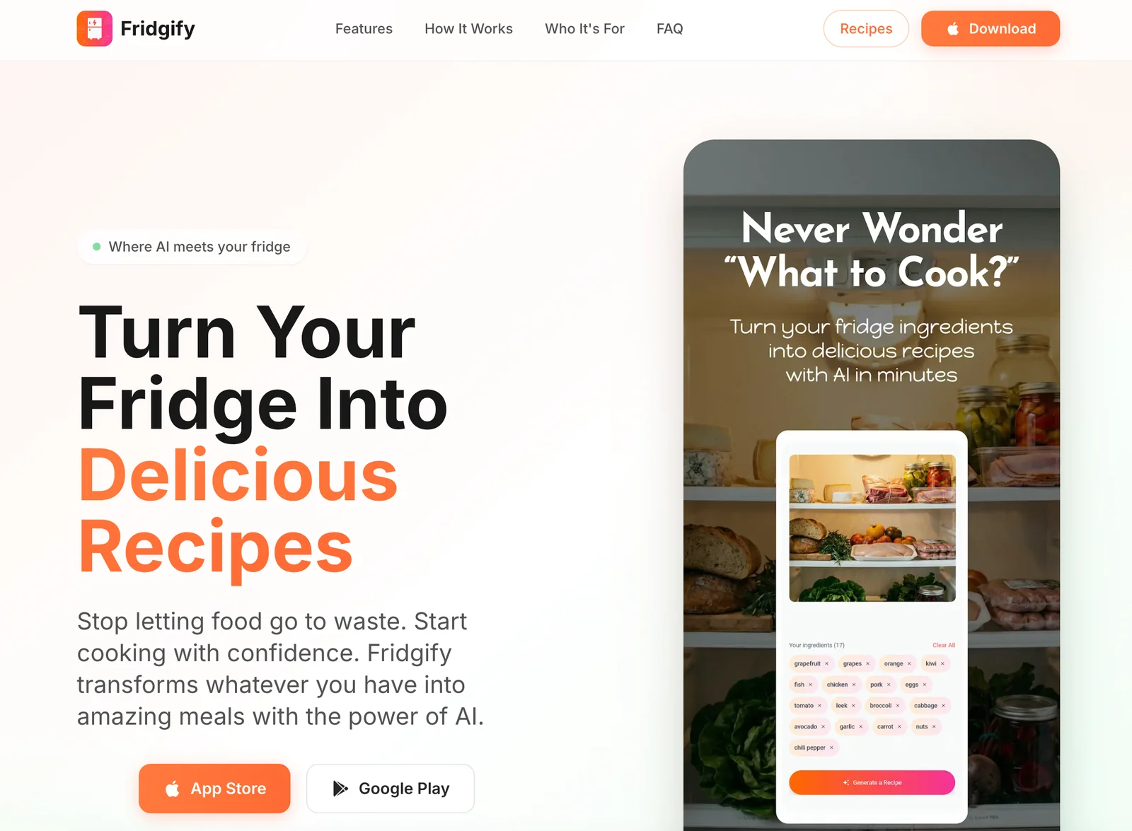 Fridgify transforms the contents of your fridge into tailored recipe suggestions by using image input and AI-driven ingredient parsing. Users snap a photo of their fridge or manually track items; the system identifies ingredients, accounts for preferences or restrictions, and generates practical recipes to use what you have. The project includes mobile frontends (iOS/Android via Expo) and an open-source backend that can be self-hosted with MongoDB, enabling developers to run or extend the service. Fridgify's value is in reducing food waste, simplifying meal planning, and offering an extensible developer workflow through public GitHub repositories.