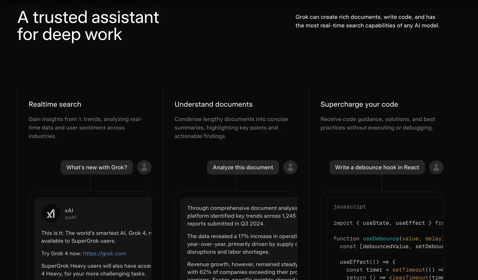 Grok is xAI's conversational assistant delivering real-time search, image generation, trend analysis, and conversational responses with a distinct personality.