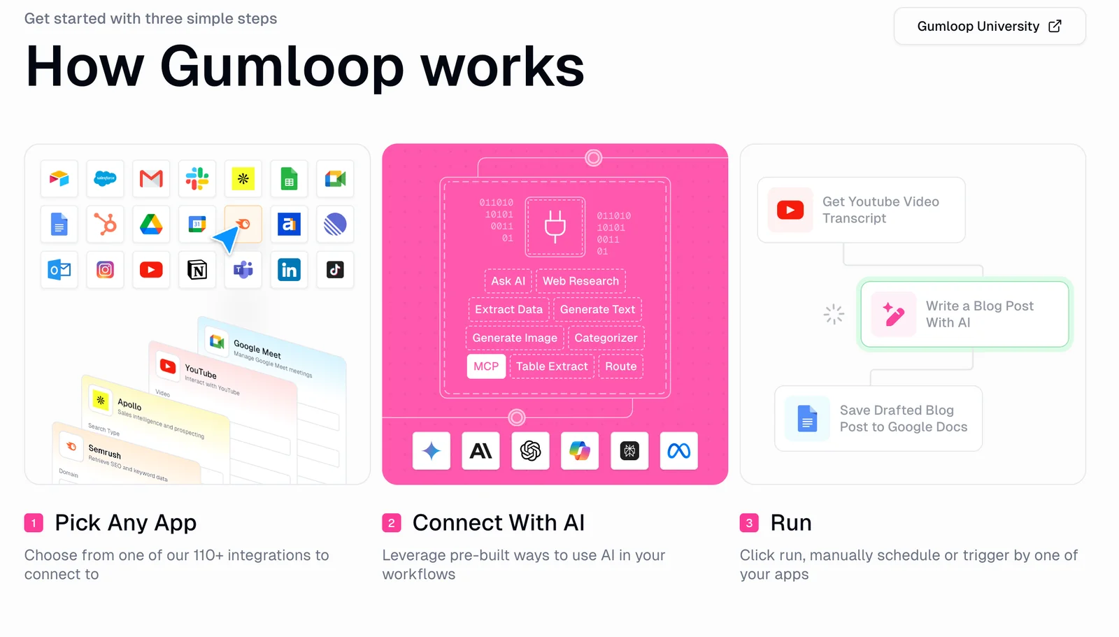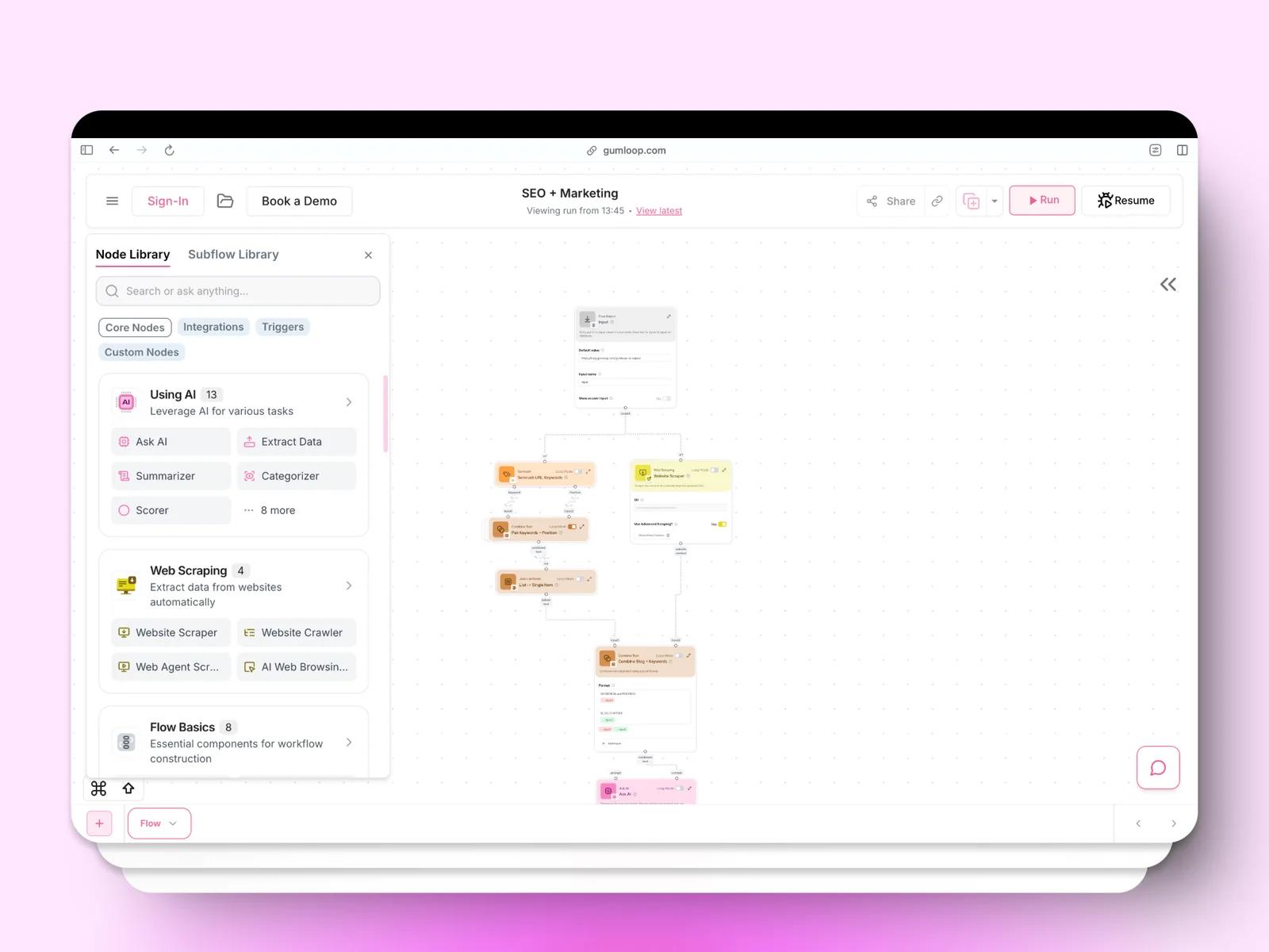 Gumloop is a no-code AI automation framework for building, deploying, and hosting AI-powered business workflows. It provides a visual workflow canvas where non-technical users can assemble multi-step automations, connect multiple LLMs, and integrate with web pages and external APIs. Gumloop emphasizes marketing-focused automations (SEO, ad campaigns, scraping) and browser automation via a Chrome extension, and offers a library of pre-built templates to accelerate common tasks. The platform is positioned for teams that need low-code/no-code orchestration of LLMs and browser actions without custom engineering.