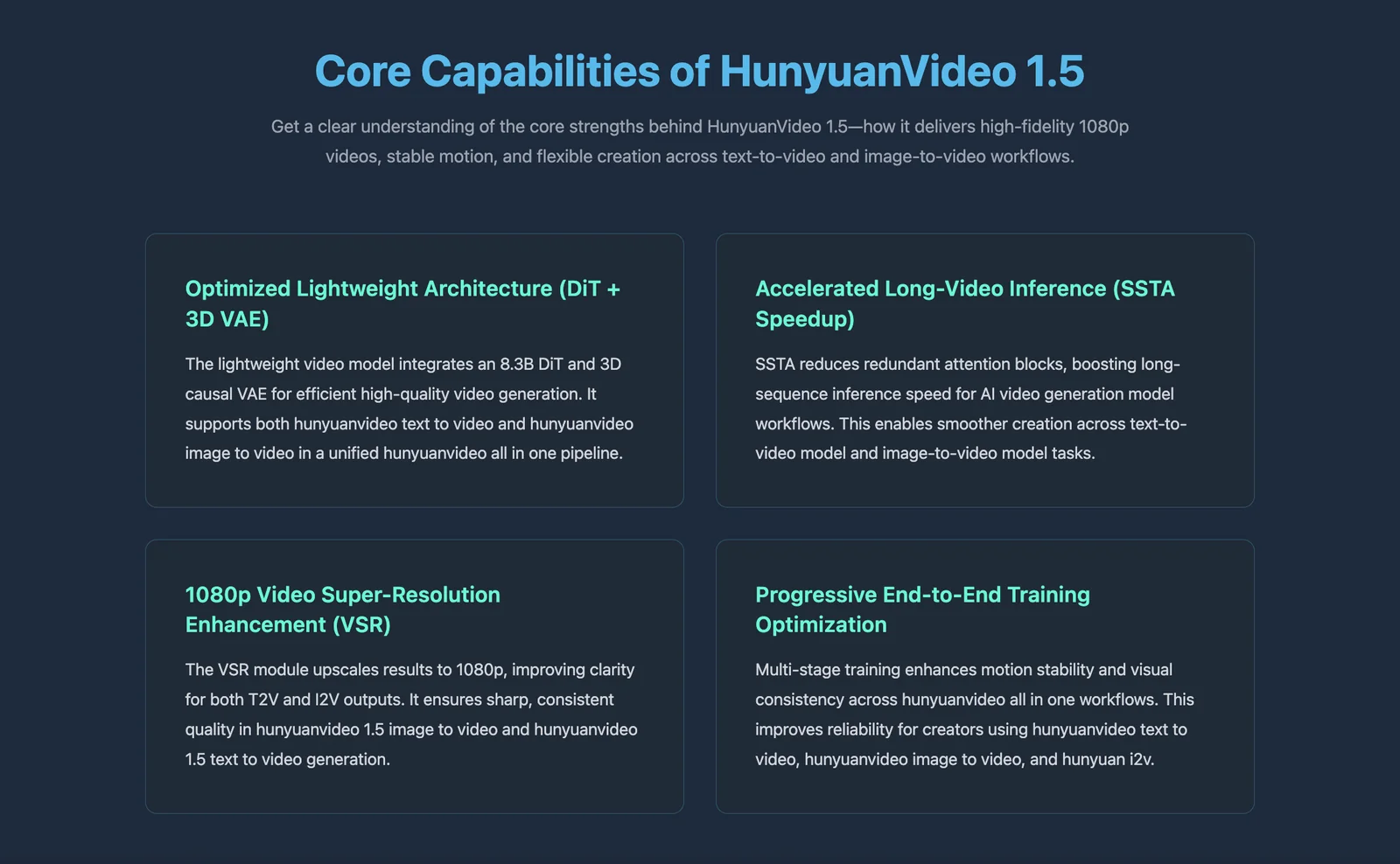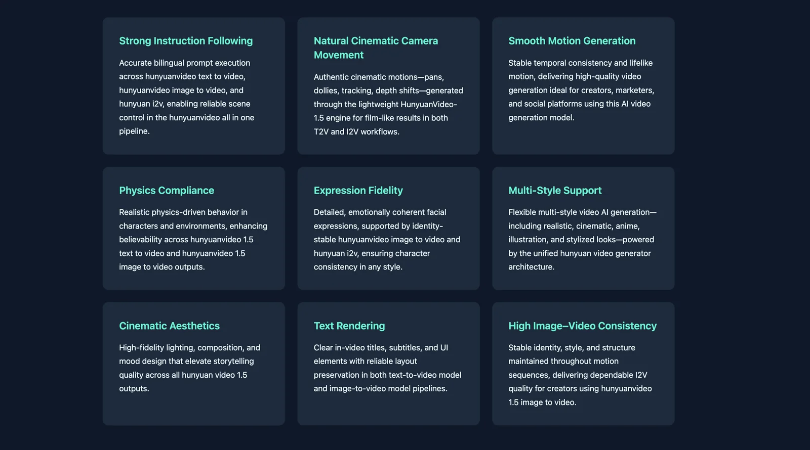 HunyuanVideo 1.5 is a lightweight video foundation model developed by Tencent for text-to-video and image-to-video generation. It produces high visual quality and improved temporal/motion consistency through image-video joint training, curated datasets, and efficient training/inference infrastructure. The model is released open-source (code and checkpoints available on GitHub) and powers specialized variants such as audio-driven human animation (HunyuanVideo-Avatar), image-to-video (I2V), and customizable generation architectures (HunyuanCustom). Third-party sources report a roughly 13B-parameter scale for the model, emphasizing an emphasis on efficiency and competitive quality versus leading closed-source video generators.