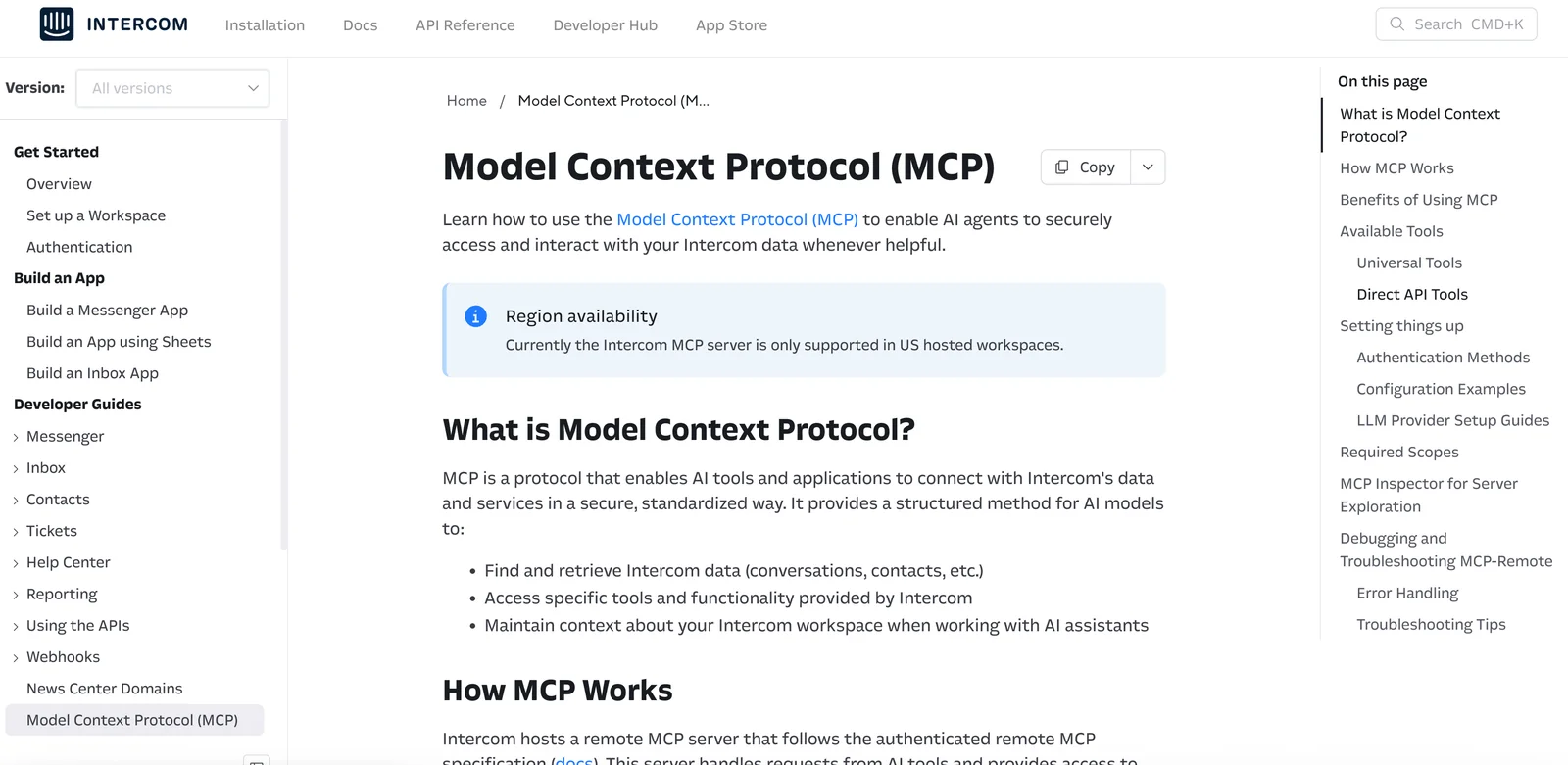 https://developers.intercom.com/docs/guides/mcphttps://mcp.intercom.com/mcphttps://mcp.intercom.com/sse💡 MCP (Model Context Protocol) enables AI assistants to securely interact with local and remote resources.