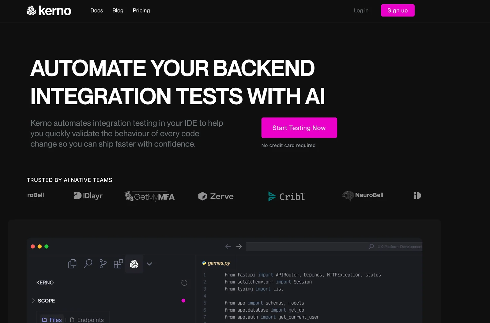 Kerno is an IDE-integrated co-pilot that autonomously generates, executes, and maintains integration tests for backend codebases. It continuously analyzes your backend services to produce comprehensive integration tests, runs them in your development environment, and updates existing tests as code evolves to reduce regressions. By automating test creation and maintenance, Kerno reduces manual QA effort, improves test coverage across edge cases, and helps teams ship backend changes faster with greater confidence. It is designed to fit into developer workflows and CI pipelines to provide ongoing verification of backend behavior.