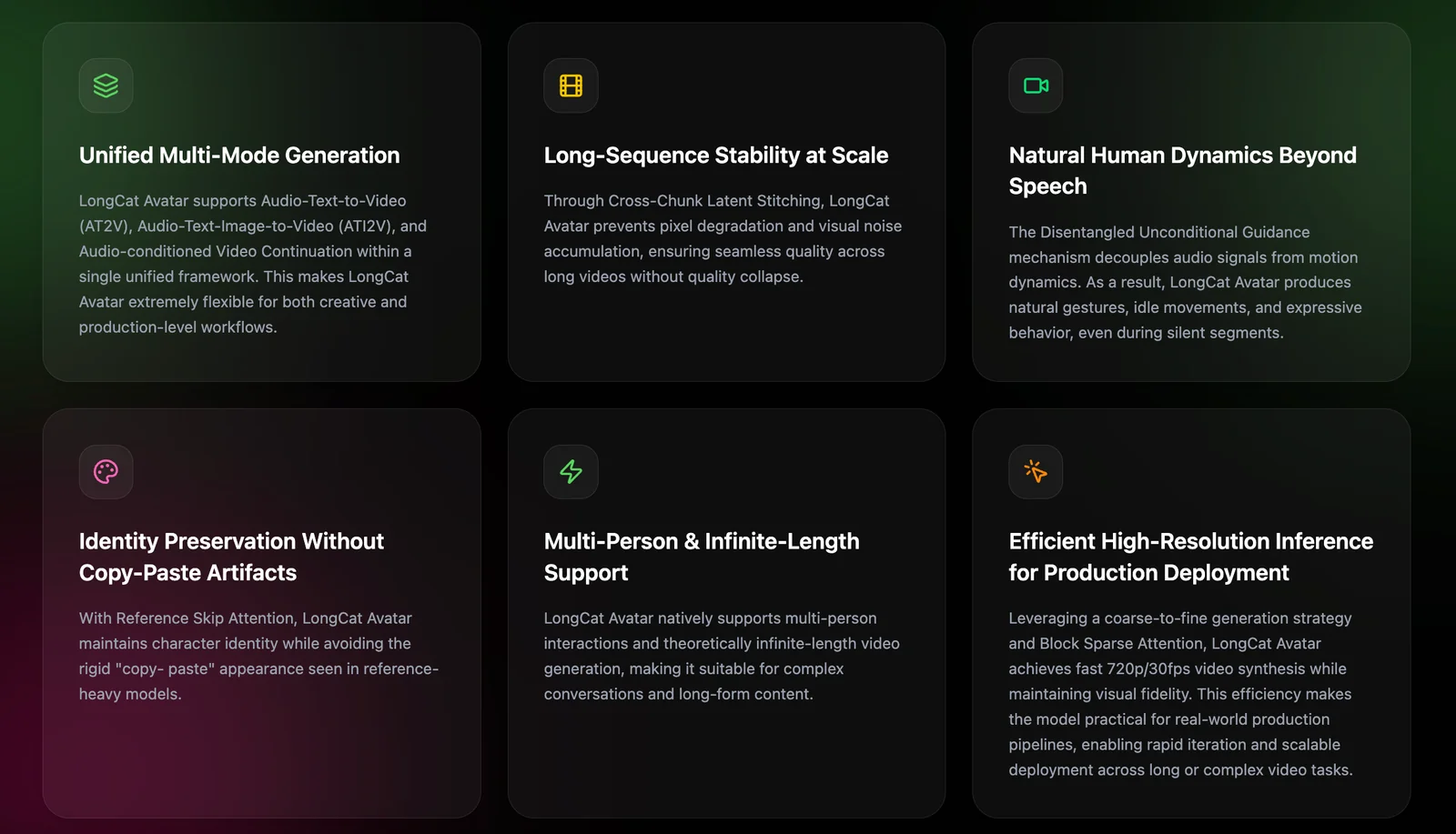 LongCat Avatar is an audio-driven video avatar generation tool that converts input audio into ultra-realistic, lip-synced video of one or more avatars. It focuses on preserving a stable identity across long sequences while producing natural head motion, expressions, and micro-movements for lifelike results. The platform supports multi-person outputs and can continue or extend existing videos while maintaining consistent appearance and motion characteristics, enabling seamless long-form avatar video creation.
