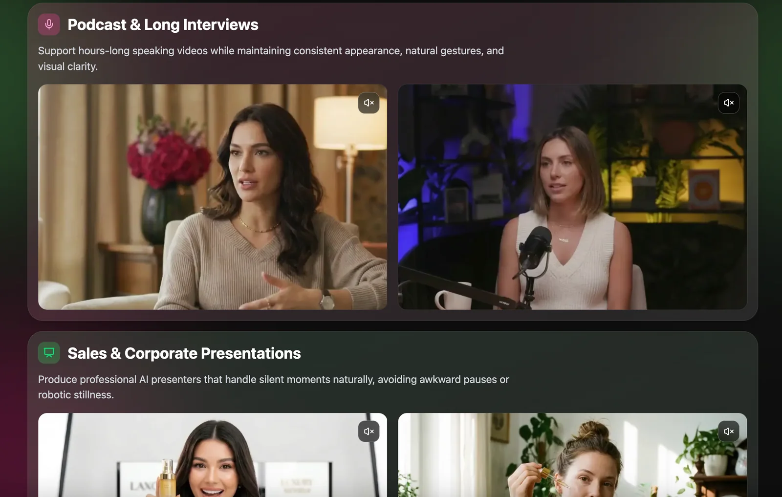 Generates ultra-realistic, audio-driven, lip-synced long avatar videos with stable identity, natural motion, multi-person support, and video continuation.