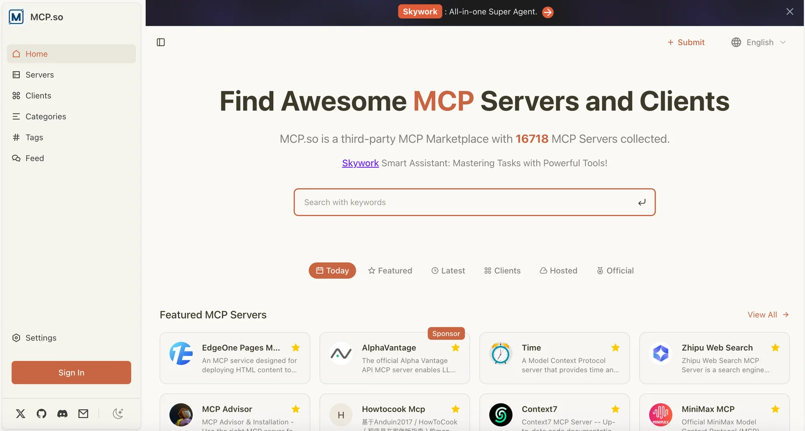 MCP.so is a centralized catalog that indexes and surfaces available MCP (Model Context Protocol) servers and integrations to extend LLMs and agentic tools. It aggregates community and official MCP server implementations, highlights integrations (for example Claude MCP integration), and links to repos, SDKs, and installation instructions. By providing searchable metadata, curated "Awesome" lists, and direct links to server projects, MCP.so speeds discovery and adoption of MCP servers for developers and organizations building context-aware AI workflows.
