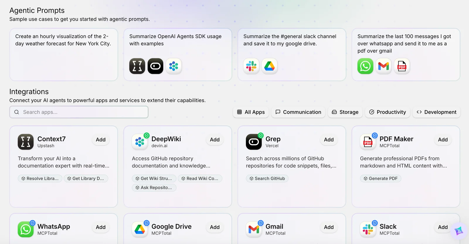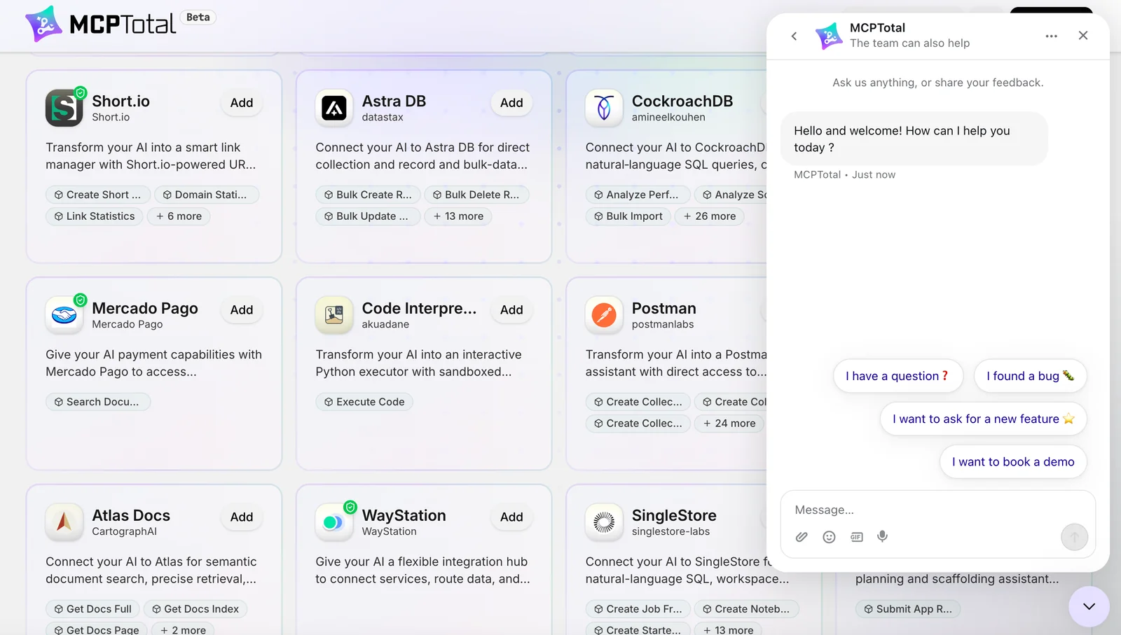 MCPTotal provides tools and extensions that integrate Model Context Protocol (MCP) servers with chat-based LLM interfaces, enabling LLMs to call external tools, fetch web content, and interact with third-party apps. It offers a Chrome extension and server tooling to surface MCP resources (connectors, prompts, tools) directly inside ChatGPT or other interfaces, letting users run actions like messaging, home automation, and web fetches from a conversation. The platform emphasizes security and production readiness by supporting firewalled, sandboxed deployments and workspace permissions, plus tooling for registering and managing MCP prompts and resources.