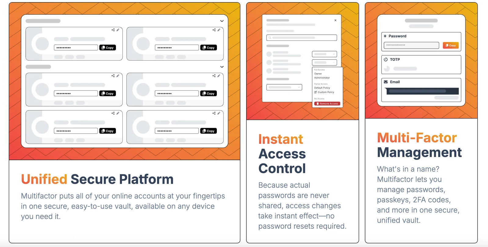 Multifactor provides a secure system to share online accounts and secrets with both humans and AI agents using trustless authentication, authorization, and auditing. It offers cryptographic primitives and open-source components — including a trust center for enclave attestation verification and a multi-factor key derivation function (MFKDF) — to enable secure secret issuance, verification, and lifecycle management. The platform is designed for modern web integrations and developer workflows, enabling programmatic validation of hardware enclave attestations, generation of enclave secrets, deterministic password generation, and demonstrator password-management applications. Multifactor emphasizes public auditability and shipping reference implementations (Rust, JavaScript) and SDKs to integrate secure sharing and attestation verification into applications and CI/CD pipelines.