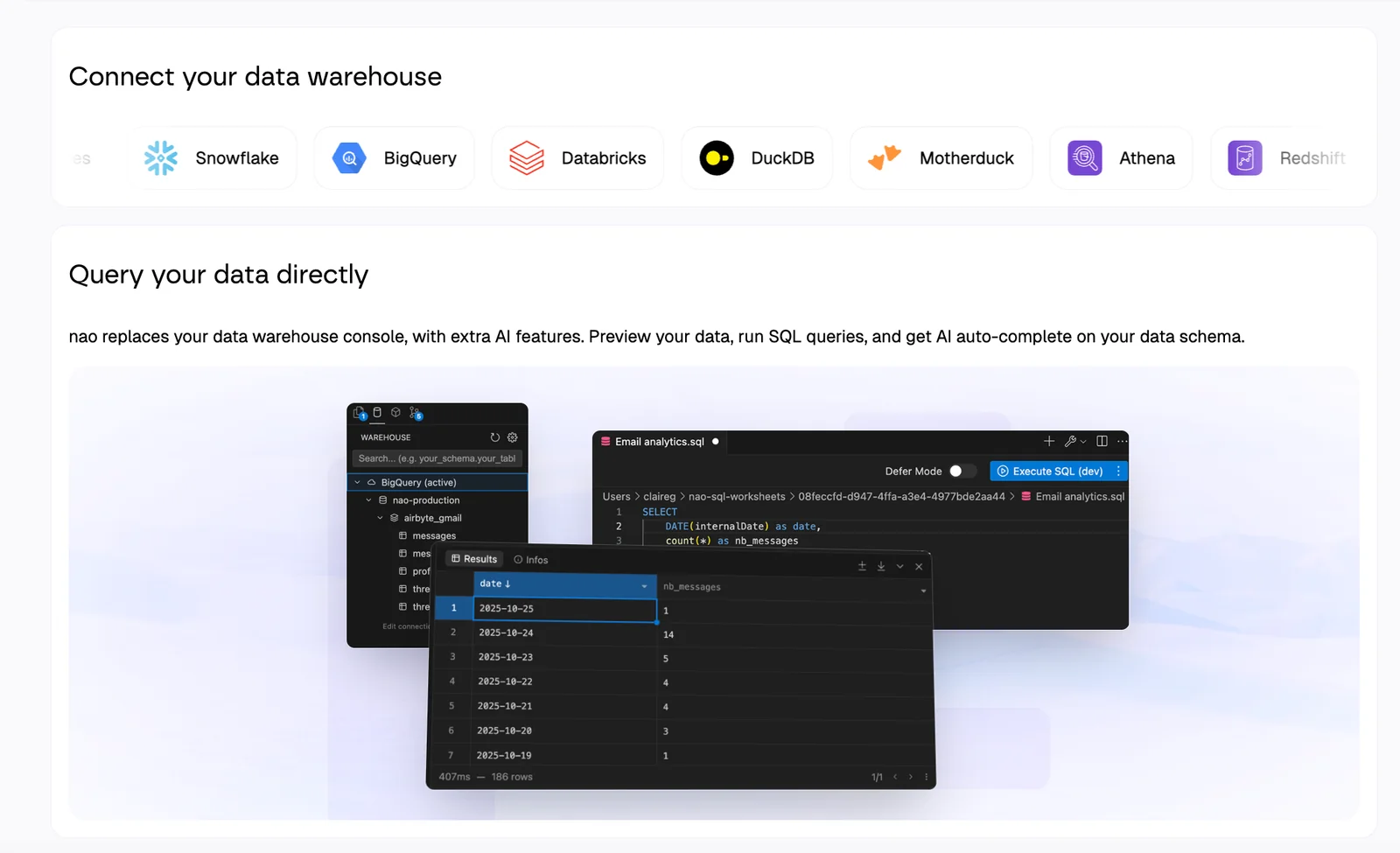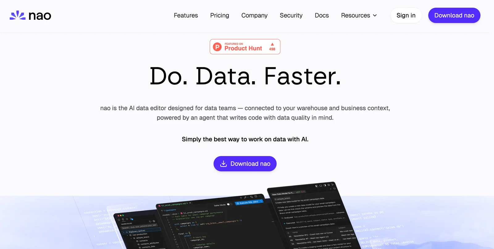 nao is presented as the first AI data editor designed to understand data work and accelerate common data tasks. It aims to provide a data-centric editor experience that reduces manual effort in cleaning, transforming, documenting, and exploring datasets, increasing productivity for data practitioners. Developed by nao Labs, the product positions itself to streamline data workflows by embedding data-aware tooling and intelligence directly into the editing environment.