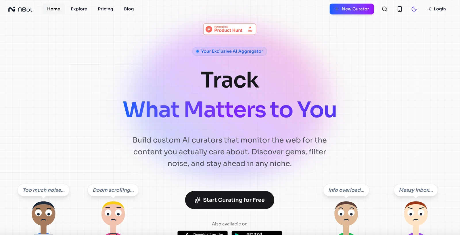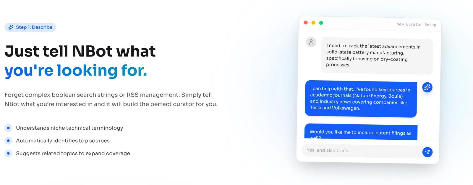 NBot is a personal AI curator and research assistant that continuously monitors the web — including news outlets, niche blogs, social media, videos and forums — to surface high-value content and filter out noise. Users define intents or topics and NBot tailors monitoring, summarization, and alerting to those specifications, delivering a personalized feed of insights and breaking events. With mobile apps and web access, NBot acts as an agent that understands user intent, helps discover overlooked gems, and reduces information overload by prioritizing what matters most.