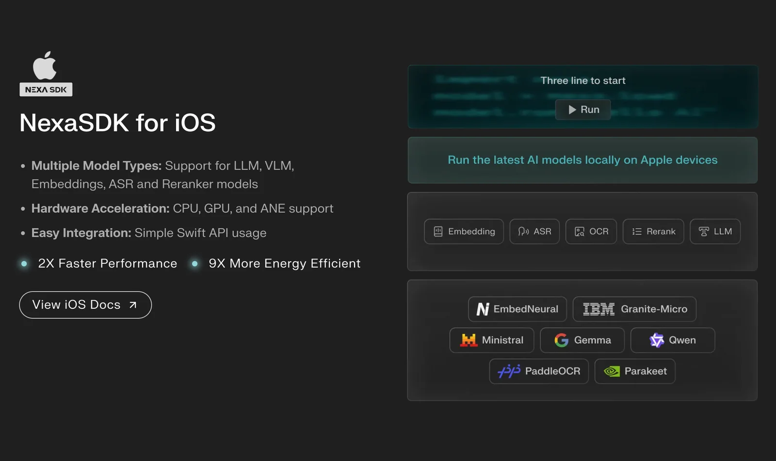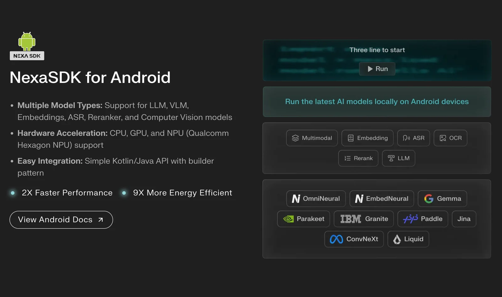 NexaSDK for Mobile is a developer toolkit that enables running and deploying large language models, multimodal models, automatic speech recognition (ASR), and text-to-speech (TTS) directly on-device across iOS and Android (and broader device classes). It provides runtimes and tooling powered by the NexaML engine to run workloads on NPUs (including Apple Neural Engine), GPUs and CPUs, delivering low-latency, private, and production-ready inference. The SDK includes platform-specific bindings (Android, CLI/Python integrations and Linux support), model conversion and optimization utilities, and runtime acceleration to minimize resource use and latency while maintaining on-device privacy and reduced cloud costs.