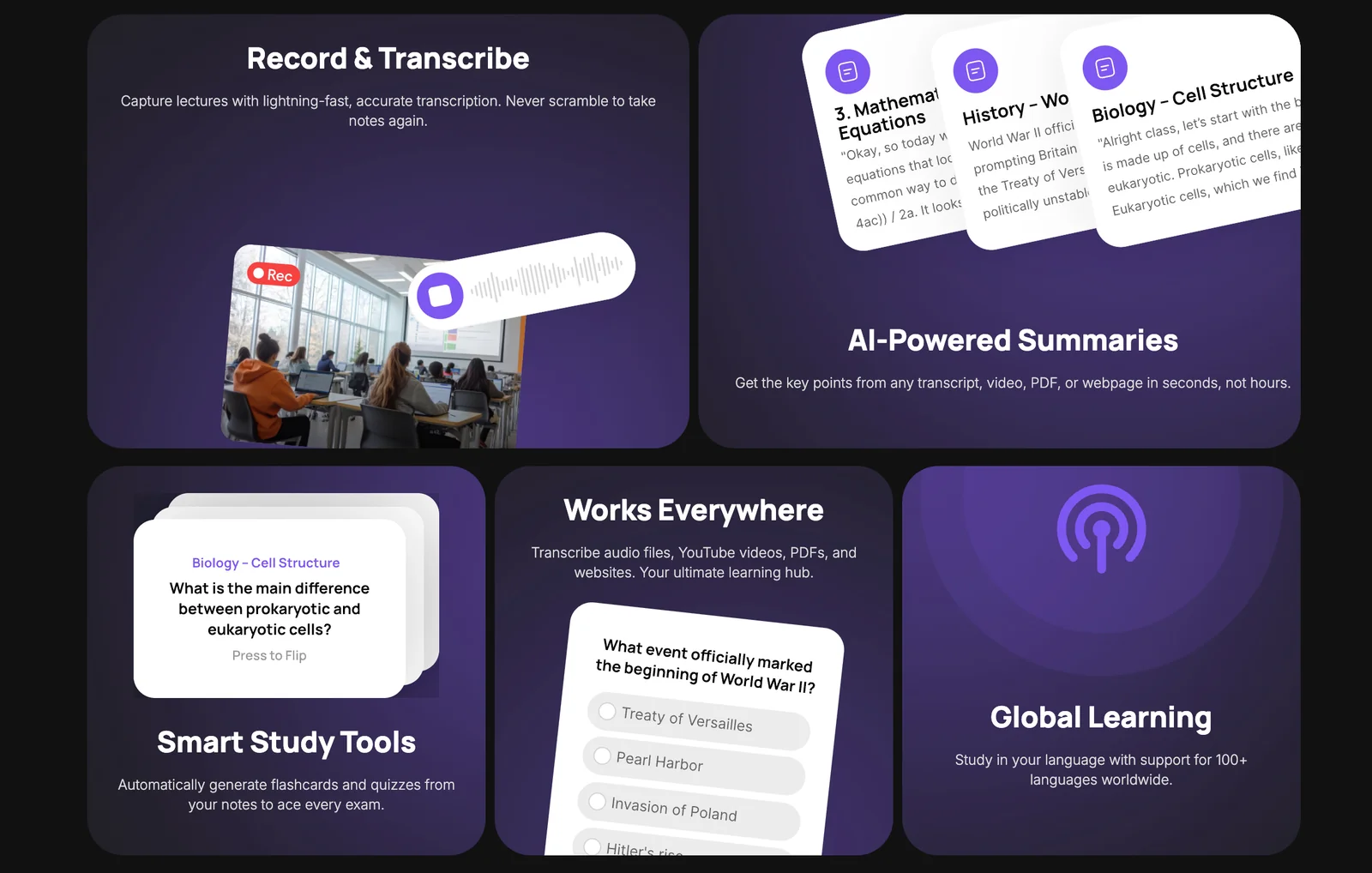 Records classes, transcribes speech accurately, and automatically converts recordings into polished study materials.
