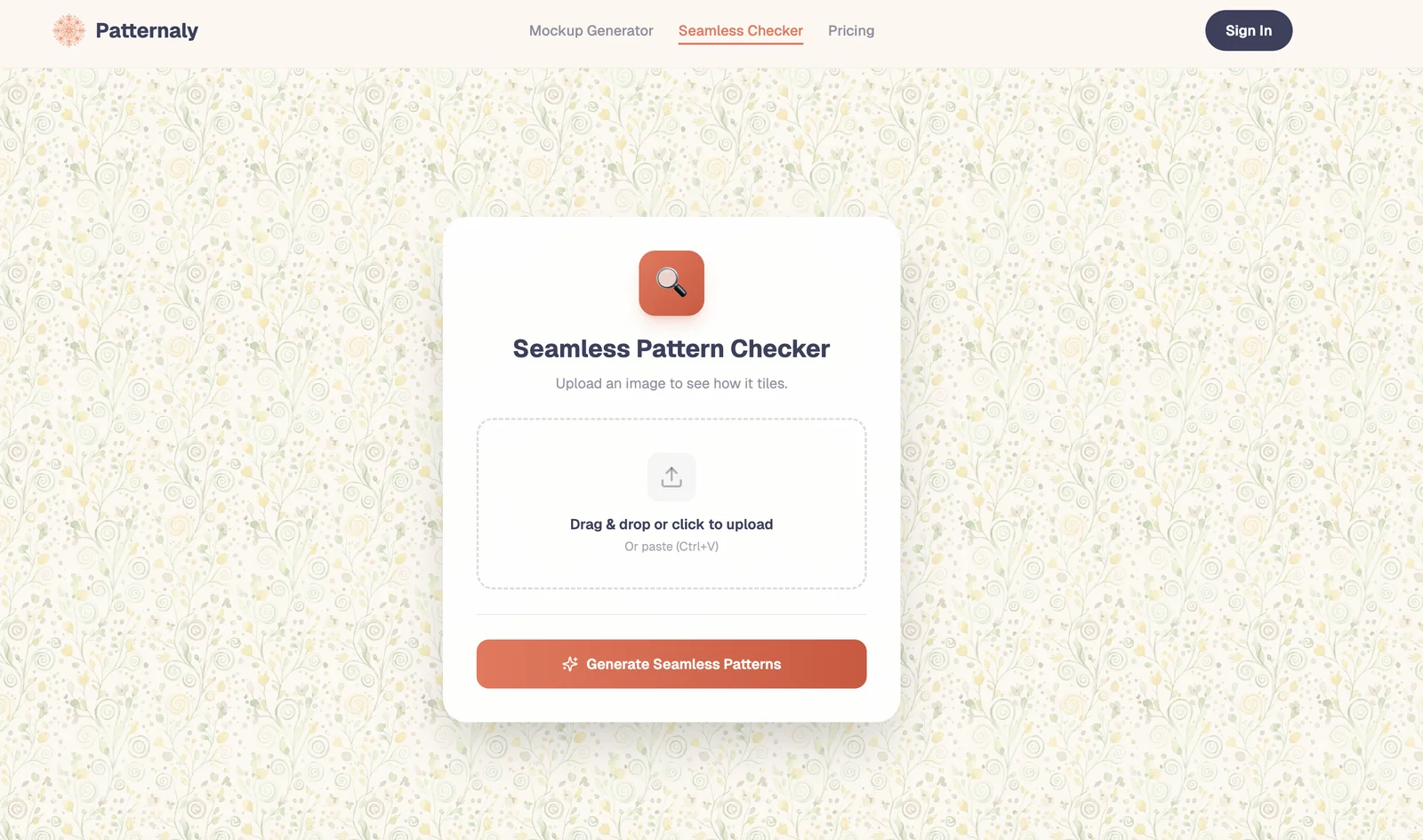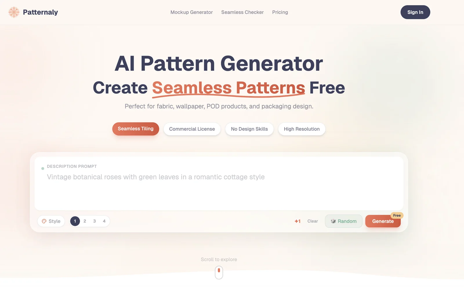 Web-based AI pattern generator that creates seamless repeating patterns from text prompts with 19 styles and instant export.