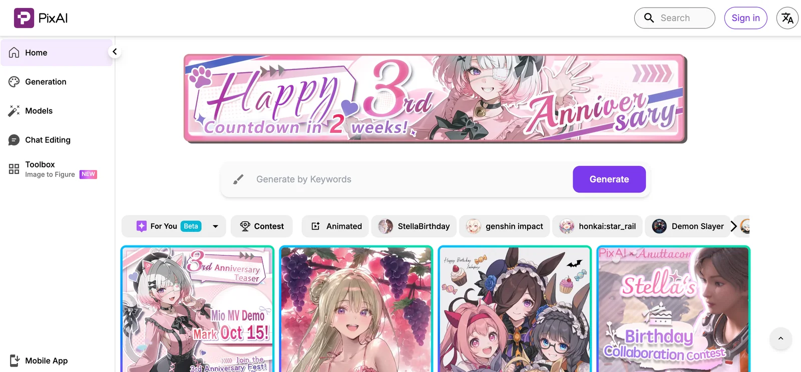 PixAI is an anime-focused AI art generator and toolkit that enables users to create high-quality anime-style images and characters from prompts and templates. It provides web-based generation tools, prebuilt character templates, and developer integration via an official JavaScript client. The PixAI ecosystem also includes related models and utilities (such as a Danbooru-style tagger on Hugging Face) and third-party iOS tools for super-resolution/upscaling, enabling workflows from generation to tagging and high-resolution refinement. PixAI emphasizes speed, usability, and accessibility for artists, hobbyists, and developers building anime-style visual content.