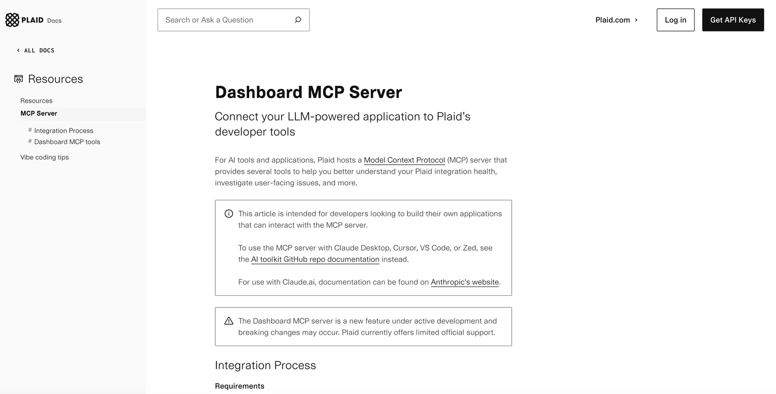 https://plaid.com/docs/resources/mcp/https://api.dashboard.plaid.com/mcp/sse💡 MCP (Model Context Protocol) enables AI assistants to securely interact with local and remote resources.