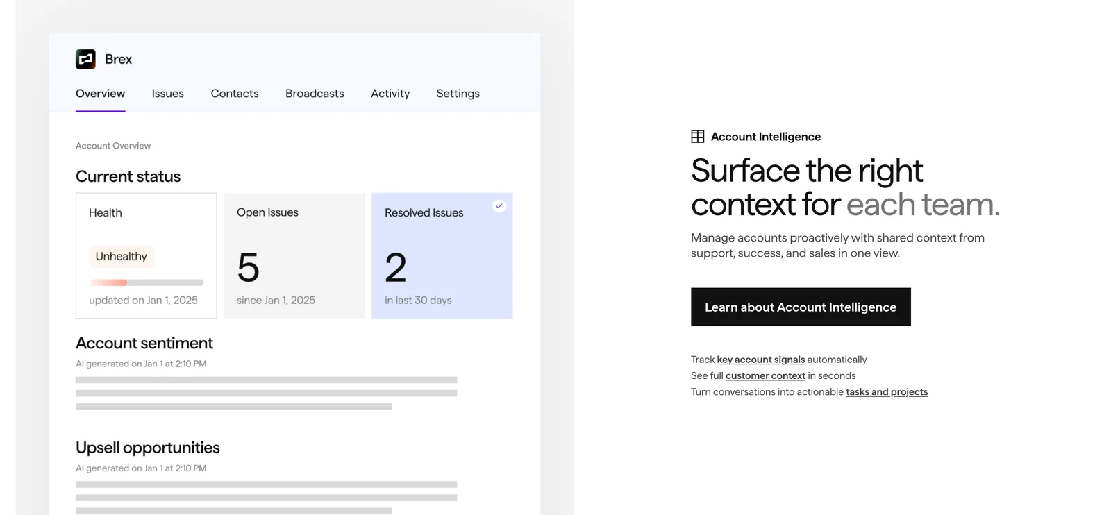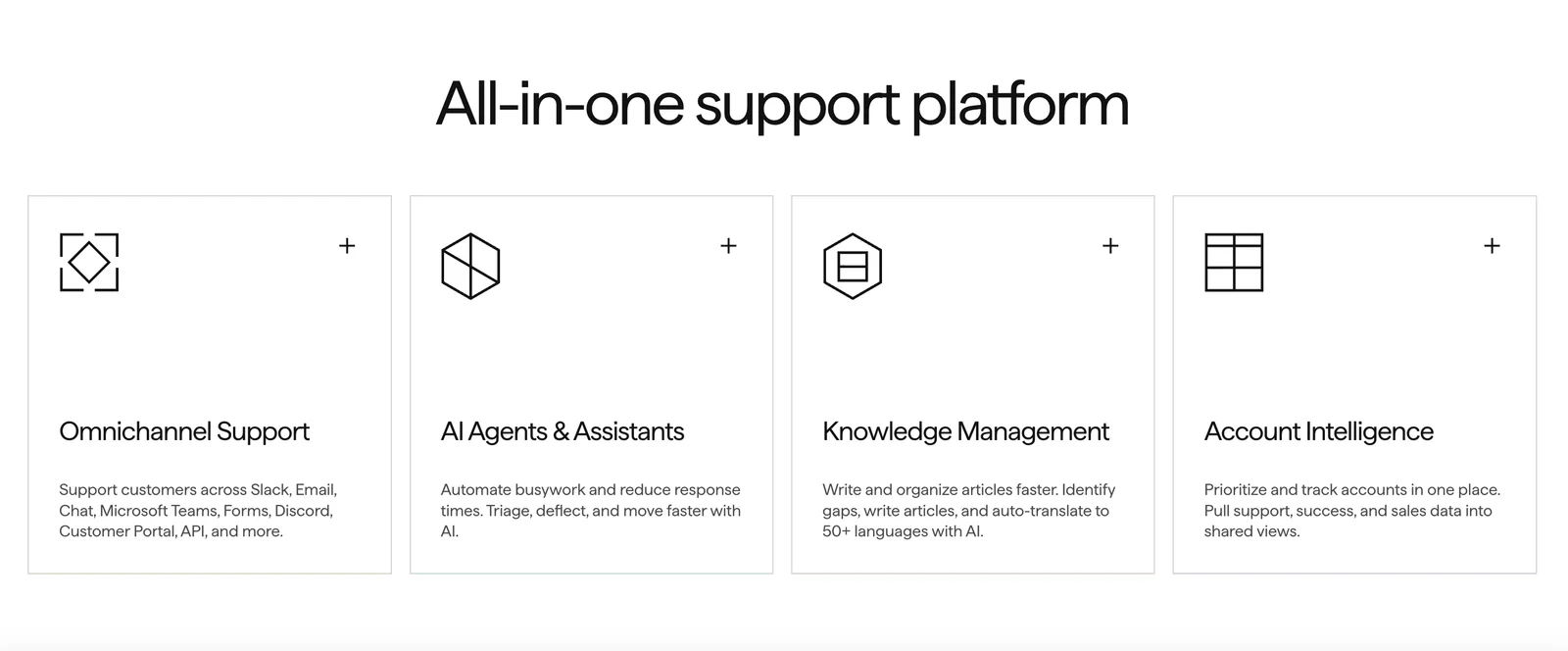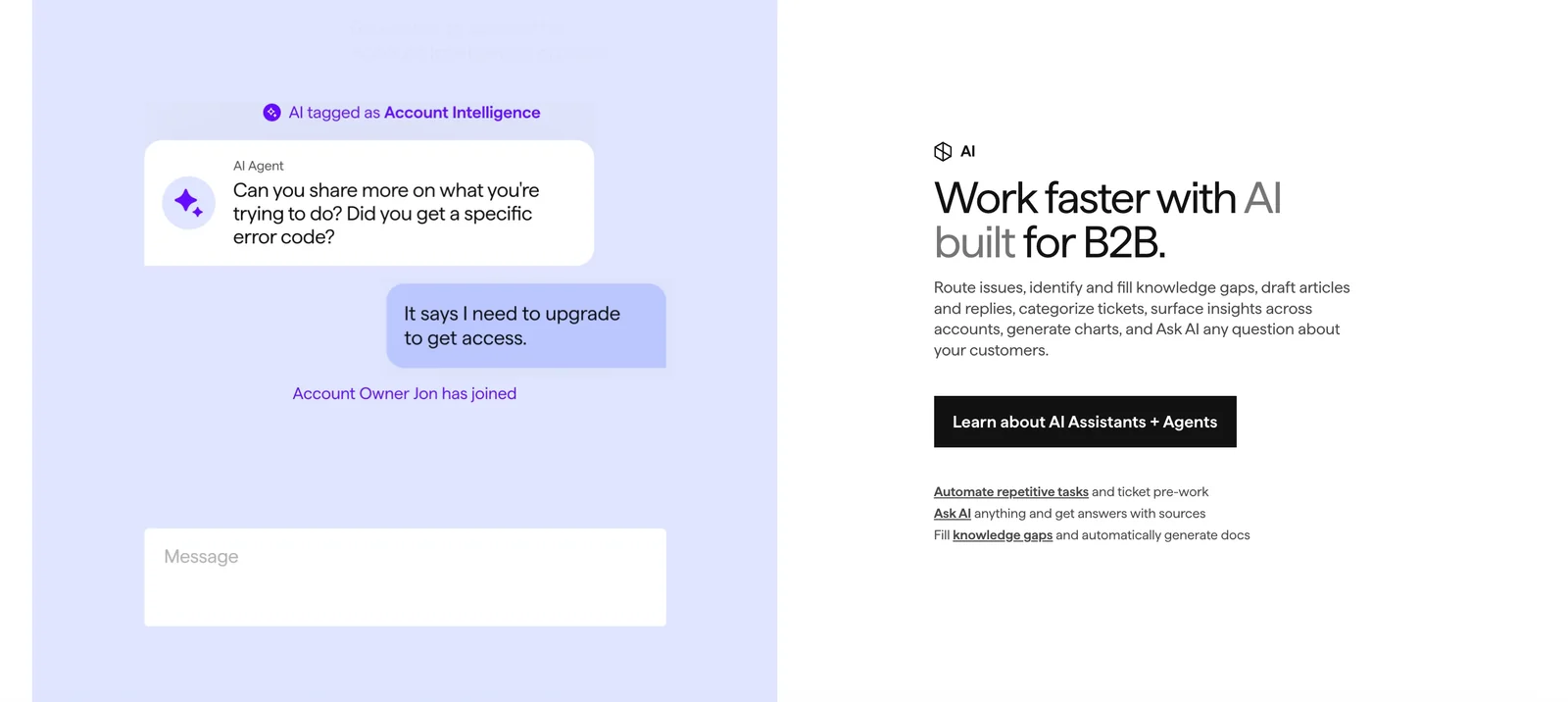 AI-native support platform for B2B companies combining ticketing, chat, knowledge base, AI support, and account intelligence.