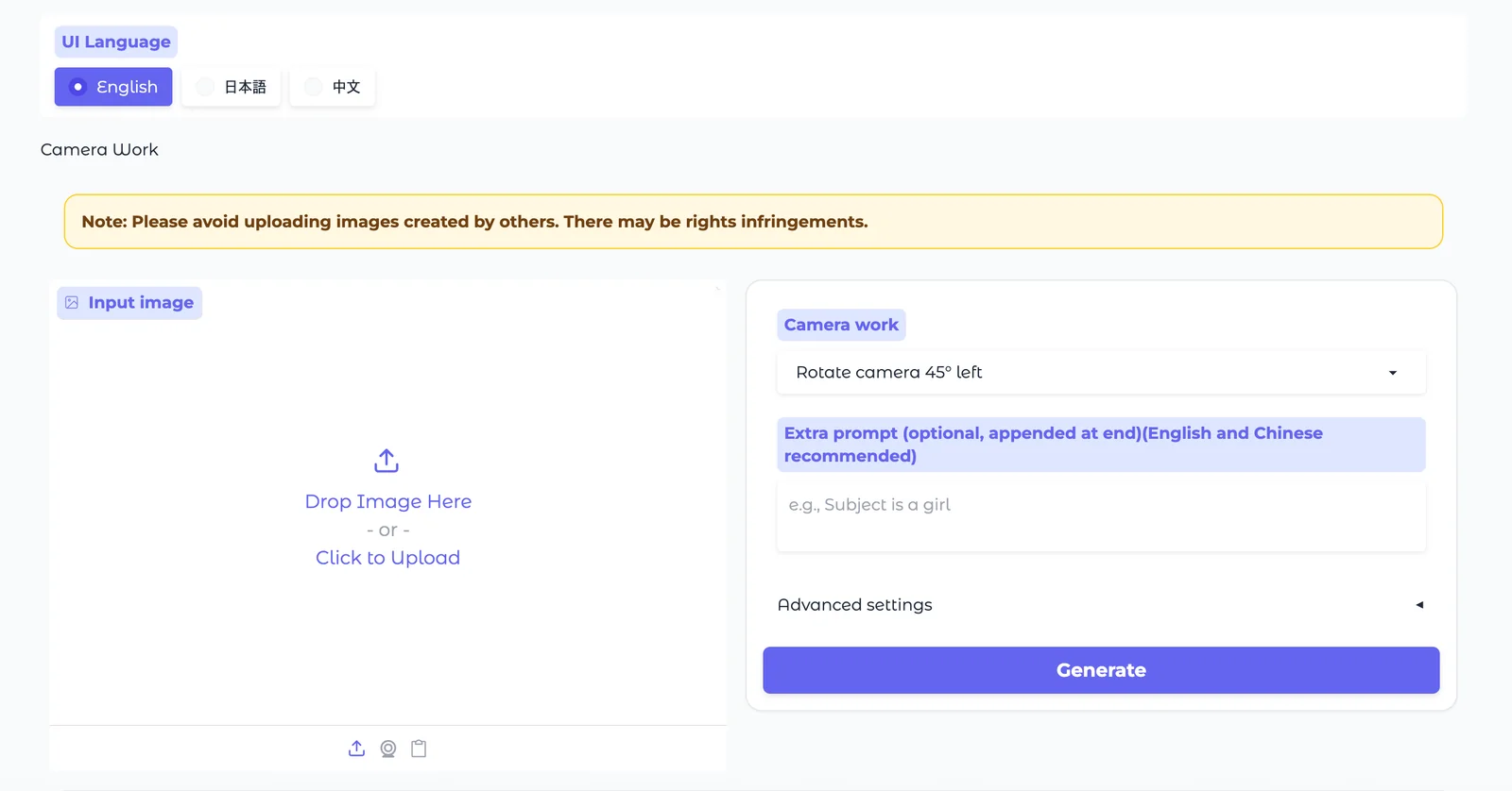 Upload an image and apply camera effects (rotation, zoom, angles) using presets or custom prompts to generate multiple views.