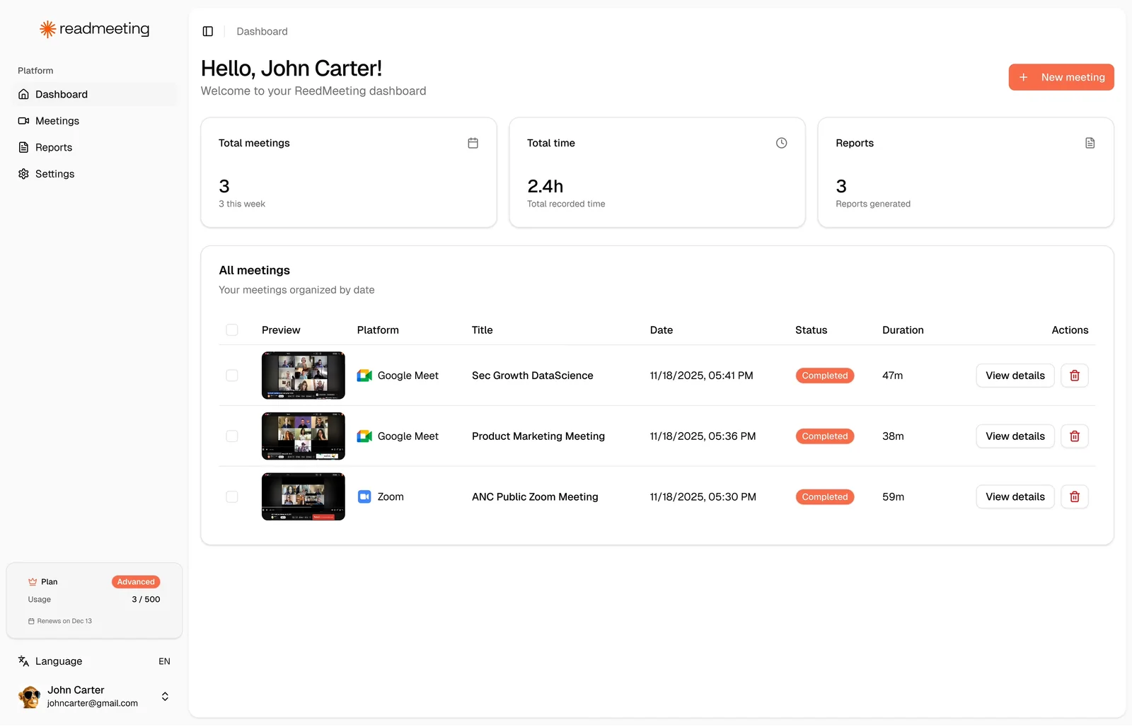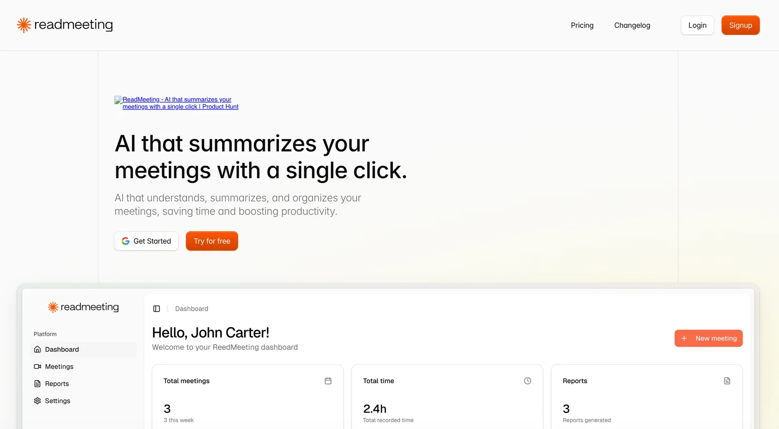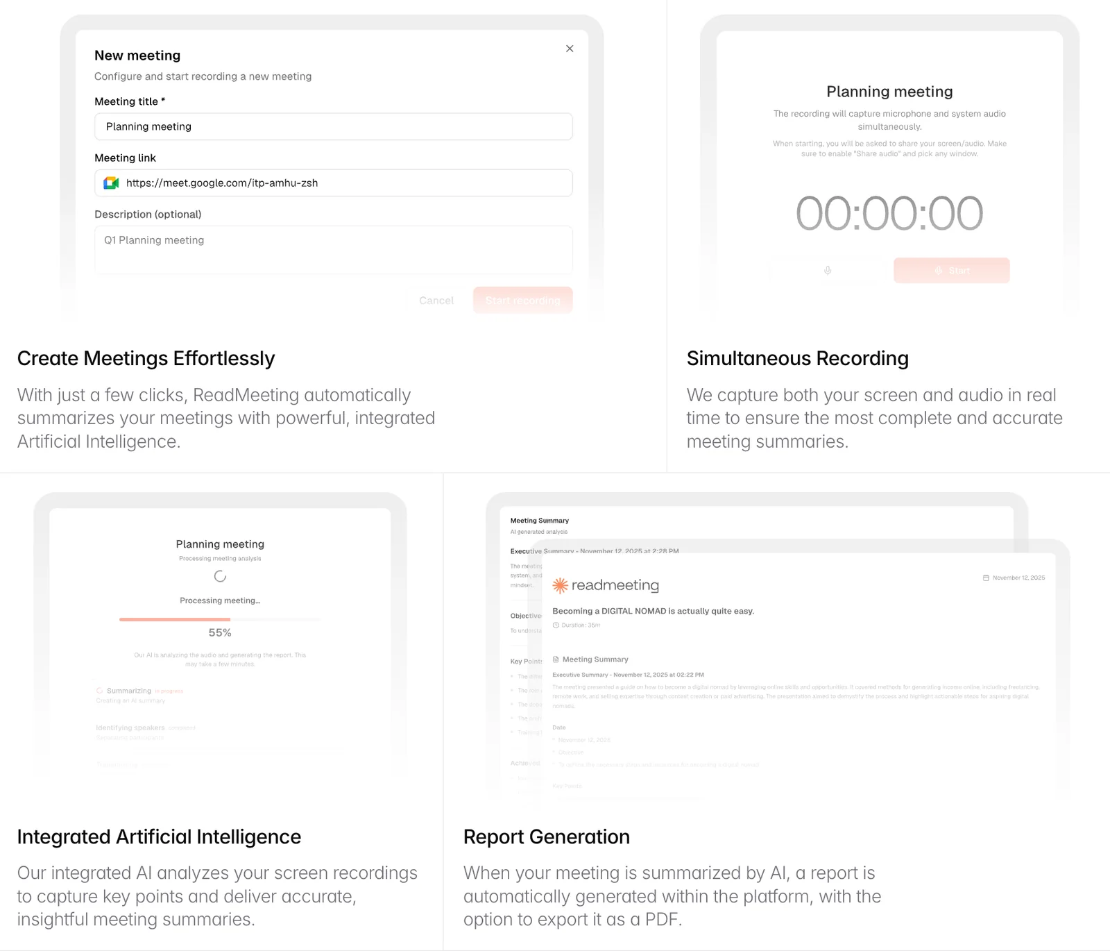 ReadMeeting uses artificial intelligence to automatically create concise summaries of meetings, emphasizing the most important points, stated goals, decisions, and identified next steps. By surfacing these highlights, ReadMeeting helps users quickly understand meeting outcomes without replaying recordings or reading full notes, enabling faster follow-up and improved team alignment. The tool is positioned to reduce time spent on meeting review and to increase actionable clarity for attendees and absentees alike.