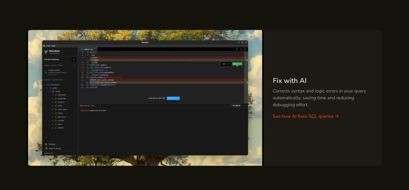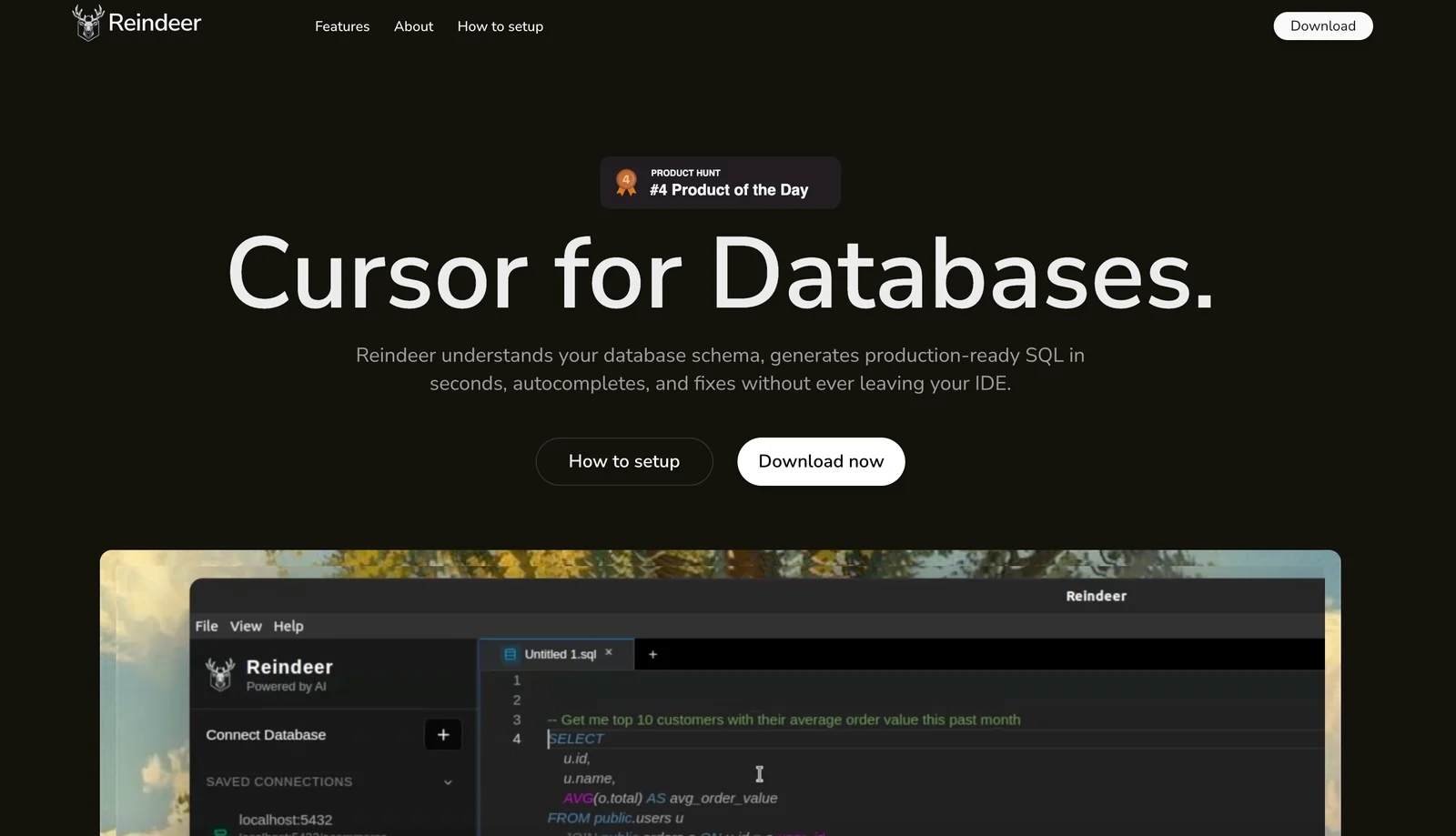 Reindeer is an AI-powered, Cursor-style integrated environment for managing databases. It analyzes your database schema to provide context-aware completions, generates production-ready SQL queries in seconds, and offers automated fixes and suggestions without forcing you to leave your development environment. The tool aims to reduce context switching, accelerate query development, and lower the chance of SQL errors by providing intelligent, schema-informed assistance directly where developers work.