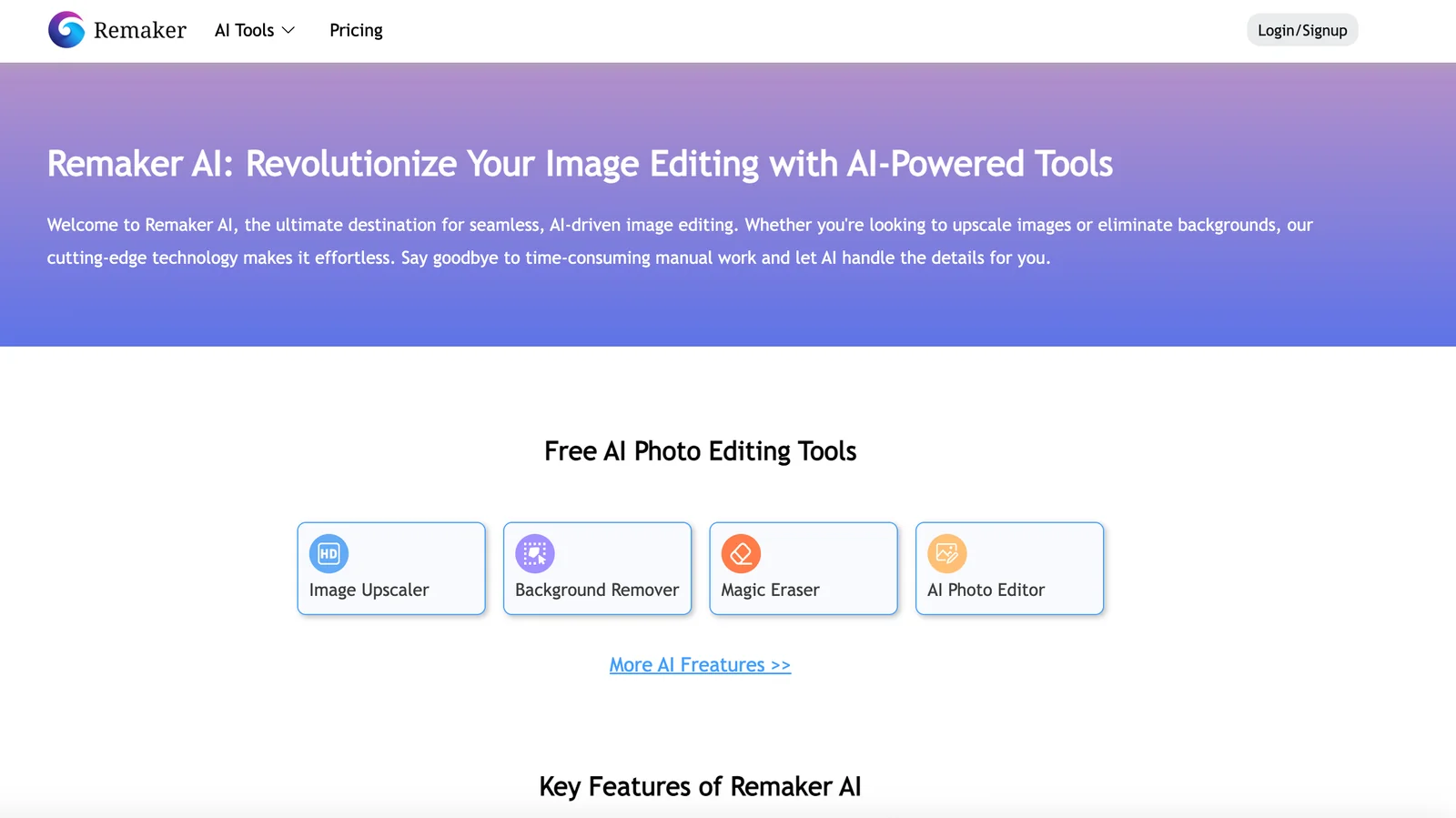 Remaker is an online image-editing service that applies machine learning to automate common photo tasks such as upscaling, background removal, denoising, and retouching. It provides a browser-based workflow that lets users quickly process single images or batches, producing export-ready files for web, print, and social media. Remaker's value is reducing manual editing time by combining multiple automated adjustments (edge-aware matting, detail-preserving upscaling, and artifact reduction) into a simple UI so non-experts can achieve professional-looking results.