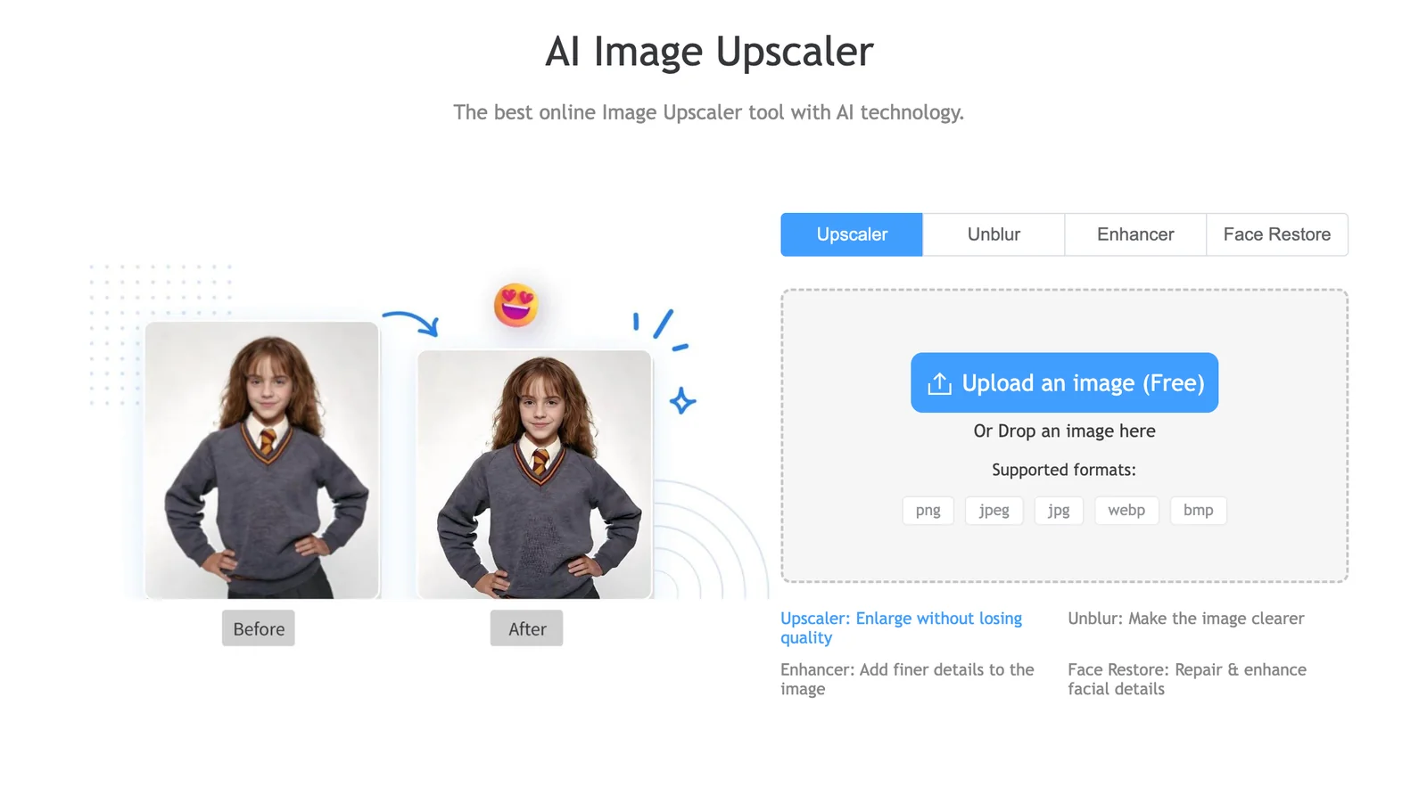 Web-based AI image editor for upscaling, background removal, and automated photo enhancement.