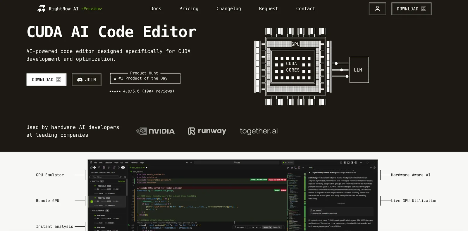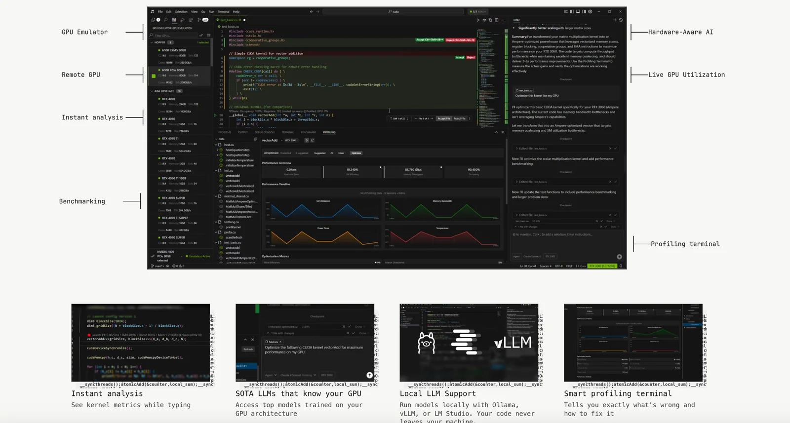 All-in-one AI-powered code editor for CUDA with hardware-aware agents, GPU emulation/virtualization, real-time profiling and enterprise benchmarking.
