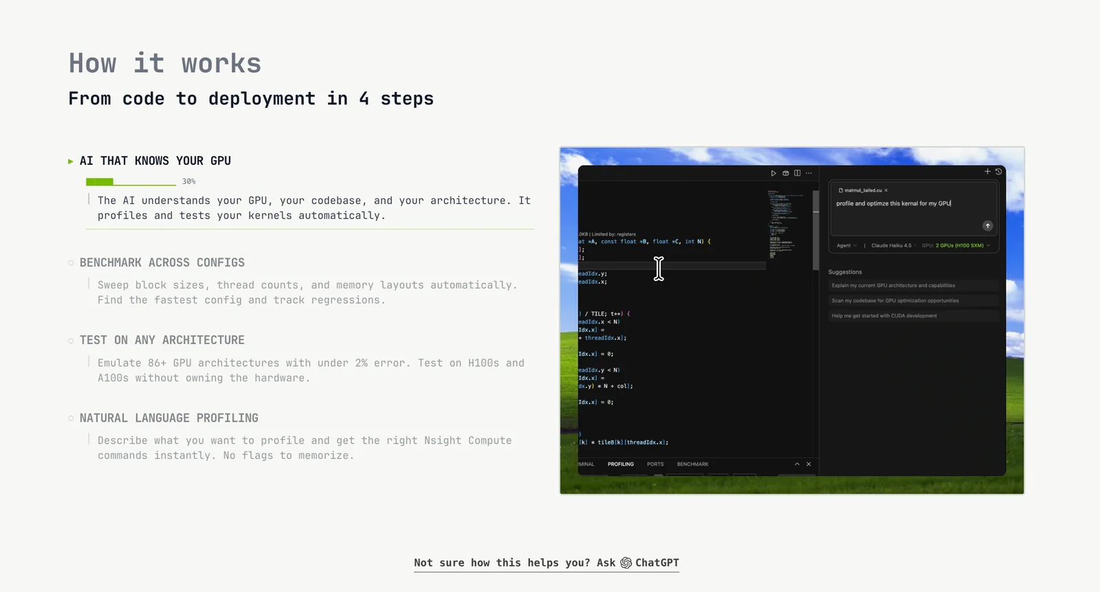 RightNow CUDA Editor (RightNow AI) is an integrated development environment and AI assistant built specifically for CUDA and NVIDIA GPU programming. It combines agentic, hardware-aware AI that reasons about GPU architecture with a GPU emulator and virtualization to allow development and testing without dedicated physical GPUs. The tool provides real-time profiling, a smart terminal, line-by-line performance analysis, and an enterprise-grade benchmarking terminal with sweep configurations for reproducible performance testing. RightNow also offers open-source CLI components, a web-based GPU profiler visualization, and workflows designed for both individual developers and teams to optimize, debug, and benchmark GPU code across cards from GTX 1060 to H100.