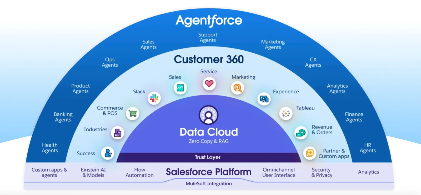 Salesforce is a cloud-based Customer Relationship Management (CRM) platform centered on Customer 360, which unifies data across marketing, sales, service, commerce and IT to create a single view of customers. It provides specialized clouds (Sales Cloud, Service Cloud, Commerce Cloud, Marketing, etc.), automation and workflow tools, a no-code/low-code/pro-code development platform, and developer tooling. Salesforce has integrated generative AI capabilities (Einstein and Einstein 1 Platform) and enterprise-ready LLMs (including partnerships such as OpenAI) to add AI-assisted insights, content generation and automation across its applications. The platform is extensible via APIs, AppExchange marketplace and open-source projects, and supports developer-centric workflows (CLI, org management, MCP integrations) to securely connect LLM-driven tools to org data.