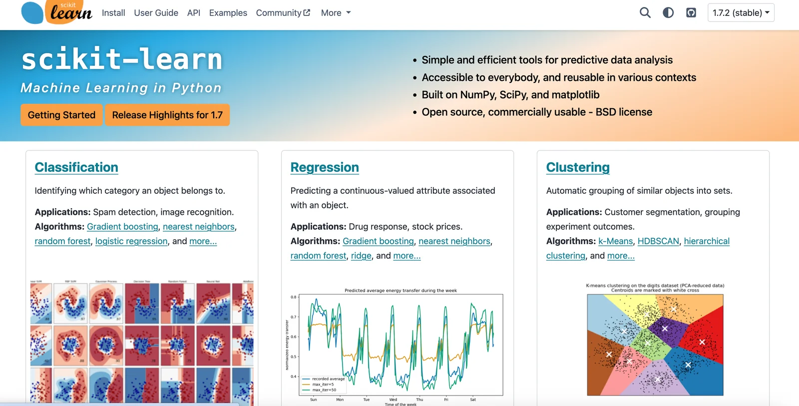 scikit-learn is an open-source Python library that implements a wide range of supervised and unsupervised machine learning algorithms and utilities. Built on top of NumPy, SciPy, and matplotlib, it provides a consistent 'estimator' API, ready-to-use implementations of classification, regression, clustering, dimensionality reduction, model selection, and preprocessing tools. scikit-learn emphasizes clean, well-documented APIs, extensive examples and tutorials, and a focus on interoperability and reproducibility (pip/conda installation, pipelines, serialization via joblib). Maintained by a global volunteer community and distributed under a permissive BSD license, it is widely used for prototyping, research, teaching, and many production workflows.