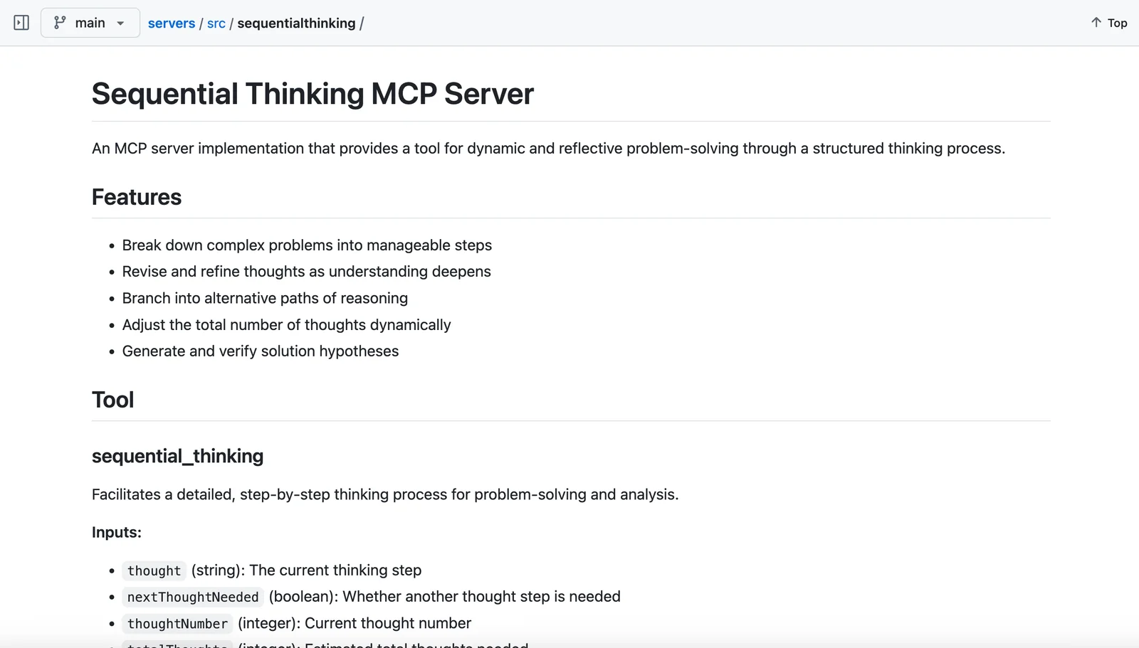 https://github.com/modelcontextprotocol/servers/tree/main/src/sequentialthinking💡 MCP (Model Context Protocol) enables AI assistants to securely interact with local and remote resources.