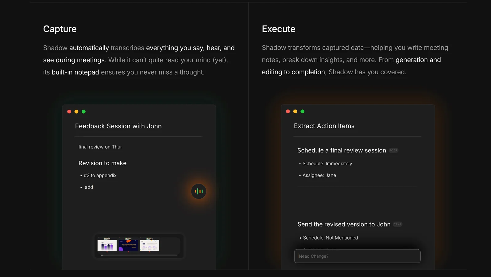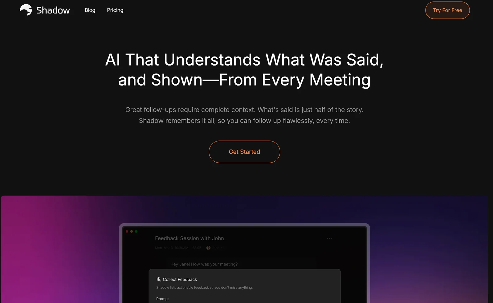 Shadow is an AI meeting assistant designed to capture both spoken content and visual materials shown during meetings so teams never lose context. It records what is said and what is shown (slides, demos, screen shares), producing searchable records that streamline follow-ups, summaries, and knowledge sharing. By preserving audio, visual context, and derived summaries or highlights, Shadow helps teams reduce misunderstandings, onboard people faster, and maintain accurate meeting archives.