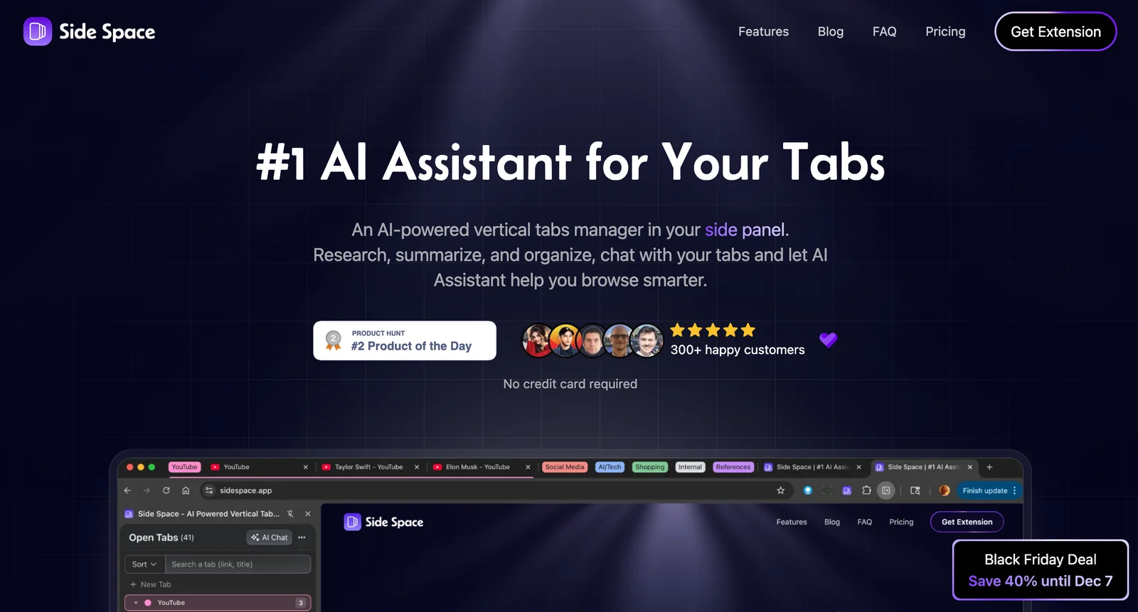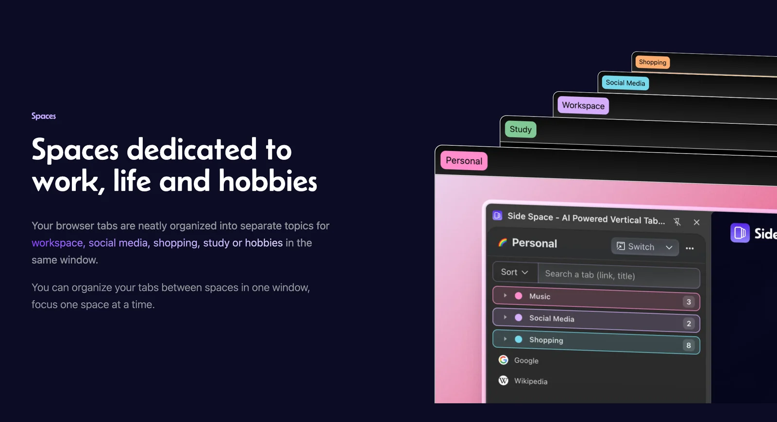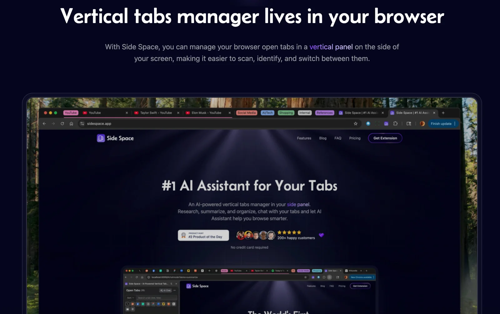 Side Space is an AI-driven browser extension that places a vertical tabs manager in the side panel to help users browse more efficiently. It enables users to research, summarize, and organize open tabs, and provides a chat interface to interact with the content across tabs. The tool is designed to surface concise summaries, assist with multi-tab research workflows, and keep browsing sessions organized so users can find insights and resume work faster.