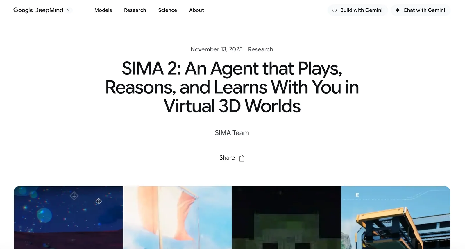 A Gemini-powered multimodal agent that plays, reasons, and learns in rich 3D virtual worlds, following instructions and adapting to new games.