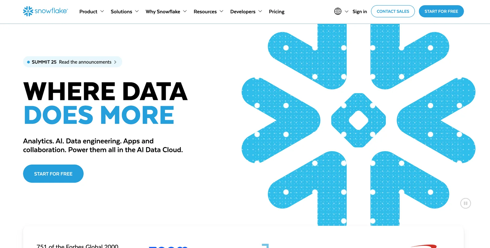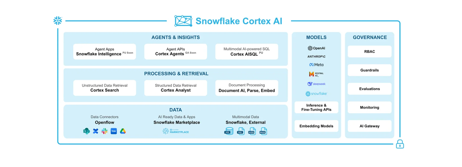 Snowflake is a cloud-native AI Data Cloud platform that unifies data storage, compute, and services to support data engineering, analytics, applications, and machine learning workloads. It provides a multi-tenant, scalable architecture with separation of storage and compute, enabling concurrent workloads without resource contention. Snowflake offers developer-facing runtimes and tools (Snowpark, CLI, SDKs), native AI capabilities (Cortex, AI Functions, integrated feature store and model registry), and secure data sharing and marketplace capabilities to collaborate and govern data across organizations. Its value lies in enabling rapid prototyping and deployment of AI-powered data applications while maintaining governance, performance, and cross-cloud portability.